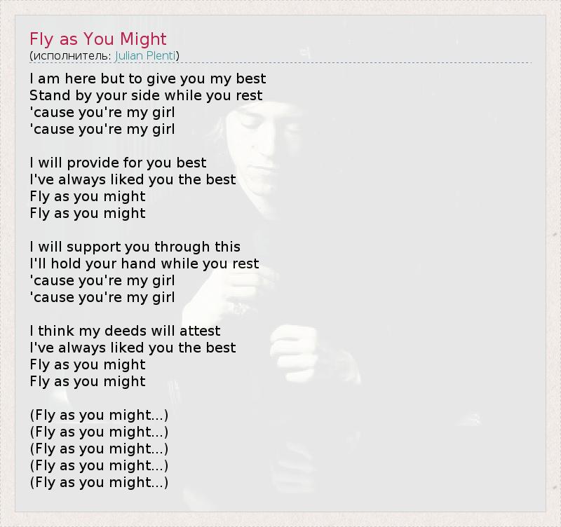 I am here but to give you my best Stand by your side while you rest 'cause you're my girl 'cause you're my girl I will provide for you best I've always liked you the best Fly as you might Fly as you might I will support you through this I'll hold your hand while you rest 'cause you're my girl 'cause you're my girl I think my deeds will attest I've always liked you the best Fly as you might Fly as you might (Fly as you might...) (Fly as you might...) (Fly as you might...) (Fly as you might...) (Fly as you might...)
