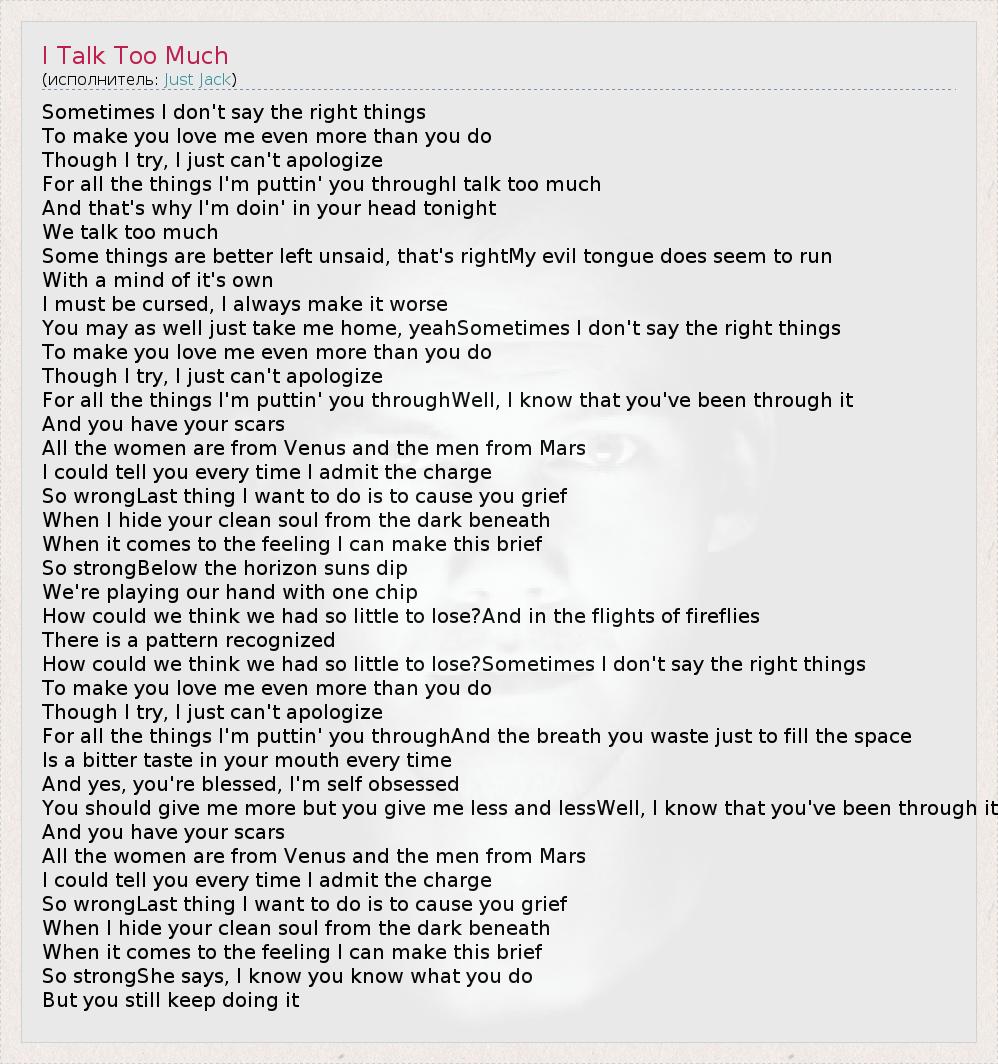 Sometimes I don't say the right things To make you love me even more than you do Though I try, I just can't apologize For all the things I'm puttin' you throughI talk too much And that's why I'm doin' in your head tonight We talk too much Some things are better left unsaid, that's rightMy evil tongue does seem to run With a mind of it's own I must be cursed, I always make it worse You may as well just take me home, yeahSometimes I don't say the right things To make you love me even more than you do Though I try, I just can't apologize For all the things I'm puttin' you throughWell, I know that you've been through it And you have your scars All the women are from Venus and the men from Mars I could tell you every time I admit the charge So wrongLast thing I want to do is to cause you grief When I hide your clean soul from the dark beneath When it comes to the feeling I can make this brief So strongBelow the horizon suns dip We're playing our hand with one chip How could we think we had so little to lose?And in the flights of fireflies There is a pattern recognized How could we think we had so little to lose?Sometimes I don't say the right things To make you love me even more than you do Though I try, I just can't apologize For all the things I'm puttin' you throughAnd the breath you waste just to fill the space Is a bitter taste in your mouth every time And yes, you're blessed, I'm self obsessed You should give me more but you give me less and lessWell, I know that you've been through it And you have your scars All the women are from Venus and the men from Mars I could tell you every time I admit the charge So wrongLast thing I want to do is to cause you grief When I hide your clean soul from the dark beneath When it comes to the feeling I can make this brief So strongShe says, I know you know what you do But you still keep doing it