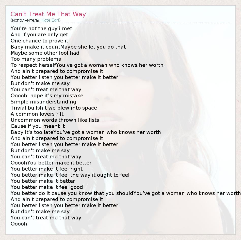 You're not the guy i met And if you are only get One chance to prove it Baby make it countMaybe she let you do that Maybe some other fool had Too many problems To respect herselfYou've got a woman who knows her worth And ain't prepared to compromise it You better listen you better make it better But don't make me say You can't treat me that way OooohI hope it's my mistake Simple misunderstanding Trivial bullshit we blew into space A common lovers rift Uncommon words thrown like fists Cause if you meant it Baby it's too lateYou've got a woman who knows her worth And ain't prepared to compromise it You better listen you better make it better But don't make me say You can't treat me that way OooohYou better make it better You better make it feel right You better make it feel the way it ought to feel You better make it better You better make it feel good You better do it cause you know that you shouldYou've got a woman who knows her worth And ain't prepared to compromise it You better listen you better make it better But don't make me say You can't treat me that way Ooooh