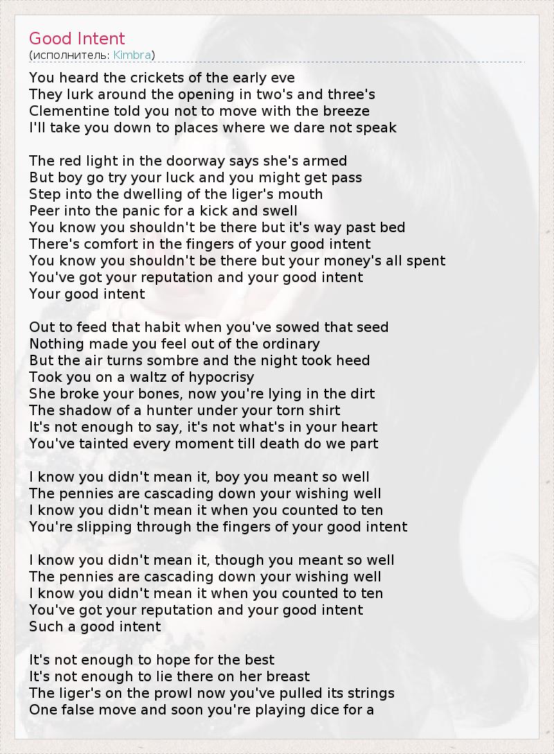Рано вечером ты слушал пение сверчков. Они прятались по щелям маленькими стайками. Клементина велела тебе не плыть по течению. Я перенесу тебя туда, где мы не посмеем раскрыть рта. Красный свет при входе сигнализирует, что она вооружена, Но, парень, иди, попытай счастья, и, может, у тебя получится. Шагни в разверстую тигриную 1 пасть, Взгляни в глаза страху ради развлечения и пущей важности. Ты знаешь, что не должен быть там, но уже давно пора в кровать. В ласке твоих пальцев чувствуются добрые намерения. Ты знаешь, что не должен быть там, но ты потратил все деньги. У тебя есть репутация и добрые намерения, Добрые намерения. Ты ушёл по зову привычки, когда заронил это семя, Ничто не внушало тебе чувства превосходства, Но воздух стал мрачен, а ночь насторожилась И закружила тебя в вальсе двуличности. Она сломала твои кости, и вот ты лежишь в грязи. Над твоей изорванной рубашкой возвышается тень охотницы. Нельзя сказать, что у тебя не было этого на сердце. Ты осквернил каждый миг до того часа, пока смерть не разлучит нас. Я знаю, ты не хотел этого, парень, ты хотел, как лучше. Пенни низвергаются каскадом в твой колодец желаний. Я знаю, ты не хотел этого, когда досчитал до десяти. Тебя подвели твои добрые намерения. Я знаю, ты не хотел этого, парень, ты хотел, как лучше. Пенни низвергаются каскадом в твой колодец желаний. Я знаю, ты не хотел этого, когда досчитал до десяти. Тебя подвели твои добрые намерения. Самые добрые намерения. Недостаточно надеяться на лучшее. Недостаточно найти покой на её груди. Тигр готов к прыжку, и ты спустил его с цепи. Одно неверное движение – и ты уже играешь в кости ради... 1 – В оригинале: liger – лигер, гибрид льва и тигрицы.