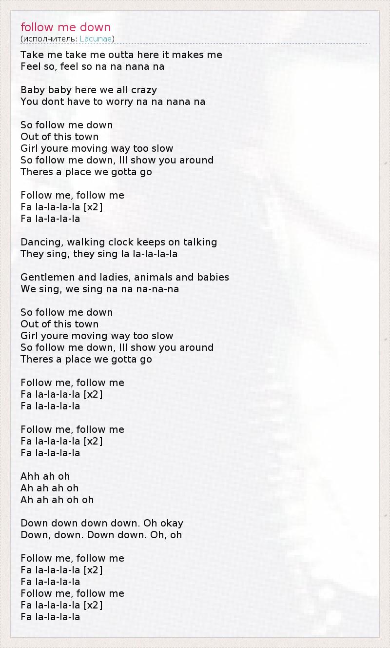 Take me take me outta here it makes me Feel so, feel so na na nana na Baby baby here we all crazy You dont have to worry na na nana na So follow me down Out of this town Girl youre moving way too slow So follow me down, Ill show you around Theres a place we gotta go Follow me, follow me Fa la-la-la-la [x2] Fa la-la-la-la Dancing, walking clock keeps on talking They sing, they sing la la-la-la-la Gentlemen and ladies, animals and babies We sing, we sing na na na-na-na So follow me down Out of this town Girl youre moving way too slow So follow me down, Ill show you around Theres a place we gotta go Follow me, follow me Fa la-la-la-la [x2] Fa la-la-la-la Follow me, follow me Fa la-la-la-la [x2] Fa la-la-la-la Ahh ah oh Ah ah ah oh Ah ah ah oh oh Down down down down. Oh okay Down, down. Down down. Oh, oh Follow me, follow me Fa la-la-la-la [x2] Fa la-la-la-la Follow me, follow me Fa la-la-la-la [x2] Fa la-la-la-la