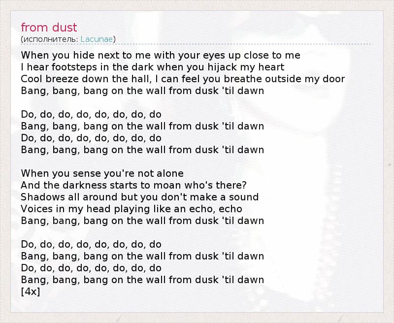 When you hide next to me with your eyes up close to me I hear footsteps in the dark when you hijack my heart Cool breeze down the hall, I can feel you breathe outside my door Bang, bang, bang on the wall from dusk 'til dawn Do, do, do, do, do, do, do, do Bang, bang, bang on the wall from dusk 'til dawn Do, do, do, do, do, do, do, do Bang, bang, bang on the wall from dusk 'til dawn When you sense you're not alone And the darkness starts to moan who's there? Shadows all around but you don't make a sound Voices in my head playing like an echo, echo Bang, bang, bang on the wall from dusk 'til dawn Do, do, do, do, do, do, do, do Bang, bang, bang on the wall from dusk 'til dawn Do, do, do, do, do, do, do, do Bang, bang, bang on the wall from dusk 'til dawn [4x]