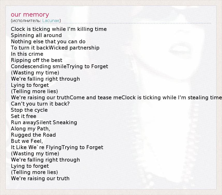 Clock is ticking while I'm killing time Spinning all around Nothing else that you can do To turn it backWicked partnership In this crime Ripping off the best Condescending smileTrying to Forget (Wasting my time) We're falling right through Lying to forget (Telling more lies) We're raising our truthCome and tease meClock is ticking while I'm stealing time Can't you turn it back? Stop the cycle Set it free Run awaySilent Sneaking Along my Path, Rugged the Road But we Feel, It Like We`re FlyingTrying to Forget (Wasting my time) We're falling right through Lying to forget (Telling more lies) We're raising our truth