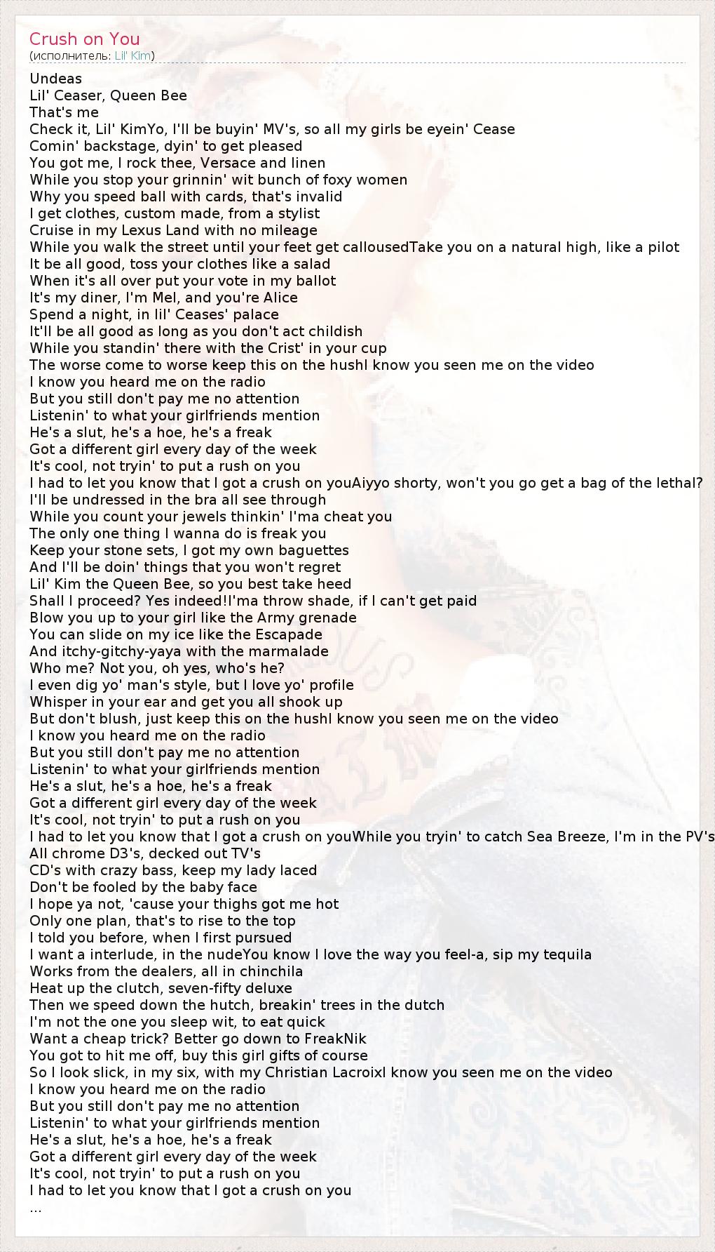 Undeas Lil' Ceaser, Queen Bee That's me Check it, Lil' KimYo, I'll be buyin' MV's, so all my girls be eyein' Cease Comin' backstage, dyin' to get pleased You got me, I rock thee, Versace and linen While you stop your grinnin' wit bunch of foxy women Why you speed ball with cards, that's invalid I get clothes, custom made, from a stylist Cruise in my Lexus Land with no mileage While you walk the street until your feet get callousedTake you on a natural high, like a pilot It be all good, toss your clothes like a salad When it's all over put your vote in my ballot It's my diner, I'm Mel, and you're Alice Spend a night, in lil' Ceases' palace It'll be all good as long as you don't act childish While you standin' there with the Crist' in your cup The worse come to worse keep this on the hushI know you seen me on the video I know you heard me on the radio But you still don't pay me no attention Listenin' to what your girlfriends mention He's a slut, he's a hoe, he's a freak Got a different girl every day of the week It's cool, not tryin' to put a rush on you I had to let you know that I got a crush on youAiyyo shorty, won't you go get a bag of the lethal? I'll be undressed in the bra all see through While you count your jewels thinkin' I'ma cheat you The only one thing I wanna do is freak you Keep your stone sets, I got my own baguettes And I'll be doin' things that you won't regret Lil' Kim the Queen Bee, so you best take heed Shall I proceed? Yes indeed!I'ma throw shade, if I can't get paid Blow you up to your girl like the Army grenade You can slide on my ice like the Escapade And itchy-gitchy-yaya with the marmalade Who me? Not you, oh yes, who's he? I even dig yo' man's style, but I love yo' profile Whisper in your ear and get you all shook up But don't blush, just keep this on the hushI know you seen me on the video I know you heard me on the radio But you still don't pay me no attention Listenin' to what your girlfriends mention He's a slut, he's a hoe, he's a freak Got a different girl every day of the week It's cool, not tryin' to put a rush on you I had to let you know that I got a crush on youWhile you tryin' to catch Sea Breeze, I'm in the PV's All chrome D3's, decked out TV's CD's with crazy bass, keep my lady laced Don't be fooled by the baby face I hope ya not, 'cause your thighs got me hot Only one plan, that's to rise to the top I told you before, when I first pursued I want a interlude, in the nudeYou know I love the way you feel-a, sip my tequila Works from the dealers, all in chinchila Heat up the clutch, seven-fifty deluxe Then we speed down the hutch, breakin' trees in the dutch I'm not the one you sleep wit, to eat quick Want a cheap trick? Better go down to FreakNik You got to hit me off, buy this girl gifts of course So I look slick, in my six, with my Christian LacroixI know you seen me on the video I know you heard me on the radio But you still don't pay me no attention Listenin' to what your girlfriends mention He's a slut, he's a hoe, he's a freak Got a different girl every day of the week It's cool, not tryin' to put a rush on you I had to let you know that I got a crush on you ...