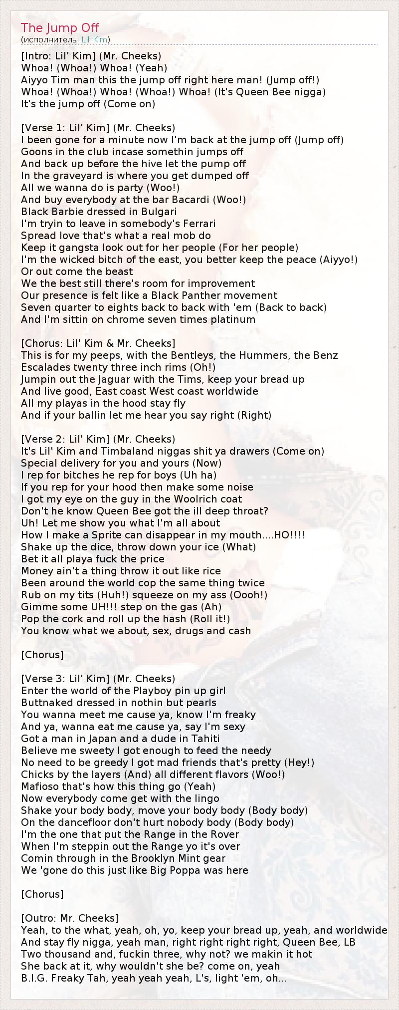 [Intro: Lil' Kim] (Mr. Cheeks) Whoa! (Whoa!) Whoa! (Yeah) Aiyyo Tim man this the jump off right here man! (Jump off!) Whoa! (Whoa!) Whoa! (Whoa!) Whoa! (It's Queen Bee nigga) It's the jump off (Come on) [Verse 1: Lil' Kim] (Mr. Cheeks) I been gone for a minute now I'm back at the jump off (Jump off) Goons in the club incase somethin jumps off And back up before the hive let the pump off In the graveyard is where you get dumped off All we wanna do is party (Woo!) And buy everybody at the bar Bacardi (Woo!) Black Barbie dressed in Bulgari I'm tryin to leave in somebody's Ferrari Spread love that's what a real mob do Keep it gangsta look out for her people (For her people) I'm the wicked bitch of the east, you better keep the peace (Aiyyo!) Or out come the beast We the best still there's room for improvement Our presence is felt like a Black Panther movement Seven quarter to eights back to back with 'em (Back to back) And I'm sittin on chrome seven times platinum [Chorus: Lil' Kim & Mr. Cheeks] This is for my peeps, with the Bentleys, the Hummers, the Benz Escalades twenty three inch rims (Oh!) Jumpin out the Jaguar with the Tims, keep your bread up And live good, East coast West coast worldwide All my playas in the hood stay fly And if your ballin let me hear you say right (Right) [Verse 2: Lil' Kim] (Mr. Cheeks) It's Lil' Kim and Timbaland niggas shit ya drawers (Come on) Special delivery for you and yours (Now) I rep for bitches he rep for boys (Uh ha) If you rep for your hood then make some noise I got my eye on the guy in the Woolrich coat Don't he know Queen Bee got the ill deep throat? Uh! Let me show you what I'm all about How I make a Sprite can disappear in my mouth....HO!!!! Shake up the dice, throw down your ice (What) Bet it all playa fuck the price Money ain't a thing throw it out like rice Been around the world cop the same thing twice Rub on my tits (Huh!) squeeze on my ass (Oooh!) Gimme some UH!!! step on the gas (Ah) Pop the cork and roll up the hash (Roll it!) You know what we about, sex, drugs and cash [Chorus] [Verse 3: Lil' Kim] (Mr. Cheeks) Enter the world of the Playboy pin up girl Buttnaked dressed in nothin but pearls You wanna meet me cause ya, know I'm freaky And ya, wanna eat me cause ya, say I'm sexy Got a man in Japan and a dude in Tahiti Believe me sweety I got enough to feed the needy No need to be greedy I got mad friends that's pretty (Hey!) Chicks by the layers (And) all different flavors (Woo!) Mafioso that's how this thing go (Yeah) Now everybody come get with the lingo Shake your body body, move your body body (Body body) On the dancefloor don't hurt nobody body (Body body) I'm the one that put the Range in the Rover When I'm steppin out the Range yo it's over Comin through in the Brooklyn Mint gear We 'gone do this just like Big Poppa was here [Chorus] [Outro: Mr. Cheeks] Yeah, to the what, yeah, oh, yo, keep your bread up, yeah, and worldwide And stay fly nigga, yeah man, right right right right, Queen Bee, LB Two thousand and, fuckin three, why not? we makin it hot She back at it, why wouldn't she be? come on, yeah B.I.G. Freaky Tah, yeah yeah yeah, L's, light 'em, oh...
