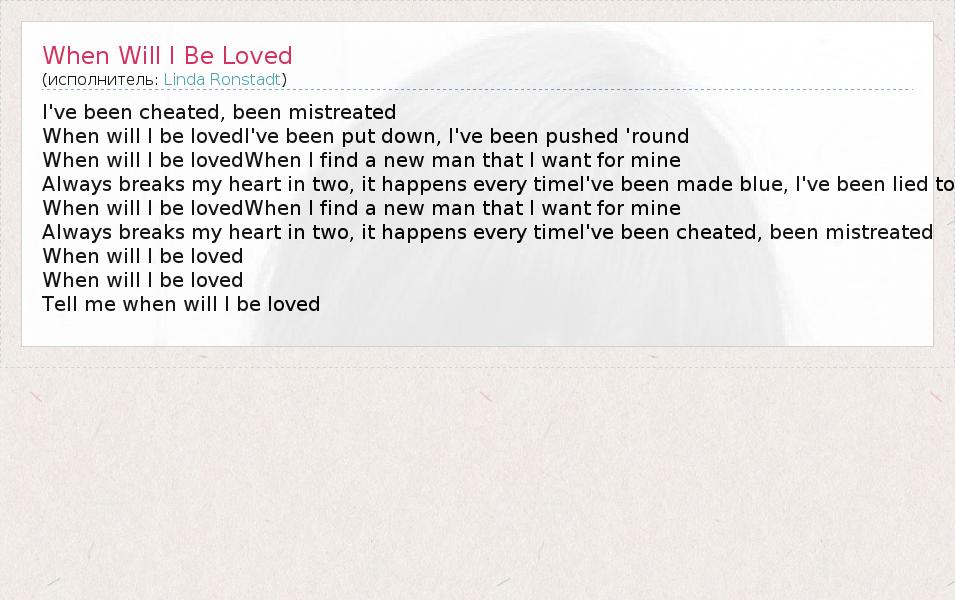 I've been cheated, been mistreated When will I be lovedI've been put down, I've been pushed 'round When will I be lovedWhen I find a new man that I want for mine Always breaks my heart in two, it happens every timeI've been made blue, I've been lied to When will I be lovedWhen I find a new man that I want for mine Always breaks my heart in two, it happens every timeI've been cheated, been mistreated When will I be loved When will I be loved Tell me when will I be loved