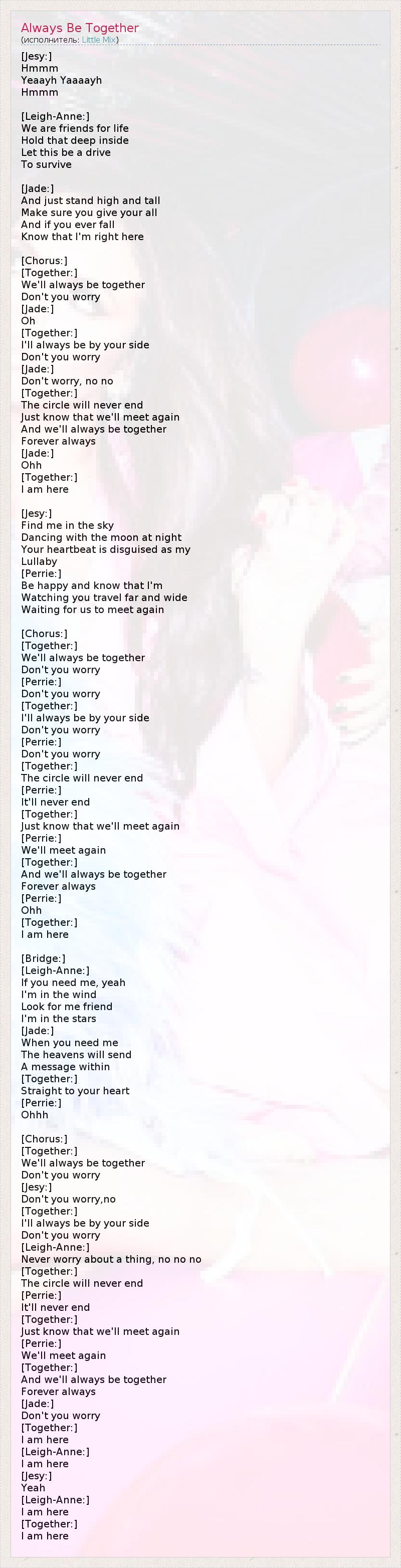 [Jesy:] Hmmm Yeaayh Yaaaayh Hmmm [Leigh-Anne:] We are friends for life Hold that deep inside Let this be a drive To survive [Jade:] And just stand high and tall Make sure you give your all And if you ever fall Know that I'm right here [Chorus:] [Together:] We'll always be together Don't you worry [Jade:] Oh [Together:] I'll always be by your side Don't you worry [Jade:] Don't worry, no no [Together:] The circle will never end Just know that we'll meet again And we'll always be together Forever always [Jade:] Ohh [Together:] I am here [Jesy:] Find me in the sky Dancing with the moon at night Your heartbeat is disguised as my Lullaby [Perrie:] Be happy and know that I'm Watching you travel far and wide Waiting for us to meet again [Chorus:] [Together:] We'll always be together Don't you worry [Perrie:] Don't you worry [Together:] I'll always be by your side Don't you worry [Perrie:] Don't you worry [Together:] The circle will never end [Perrie:] It'll never end [Together:] Just know that we'll meet again [Perrie:] We'll meet again [Together:] And we'll always be together Forever always [Perrie:] Ohh [Together:] I am here [Bridge:] [Leigh-Anne:] If you need me, yeah I'm in the wind Look for me friend I'm in the stars [Jade:] When you need me The heavens will send A message within [Together:] Straight to your heart [Perrie:] Ohhh [Chorus:] [Together:] We'll always be together Don't you worry [Jesy:] Don't you worry,no [Together:] I'll always be by your side Don't you worry [Leigh-Anne:] Never worry about a thing, no no no [Together:] The circle will never end [Perrie:] It'll never end [Together:] Just know that we'll meet again [Perrie:] We'll meet again [Together:] And we'll always be together Forever always [Jade:] Don't you worry [Together:] I am here [Leigh-Anne:] I am here [Jesy:] Yeah [Leigh-Anne:] I am here [Together:] I am here