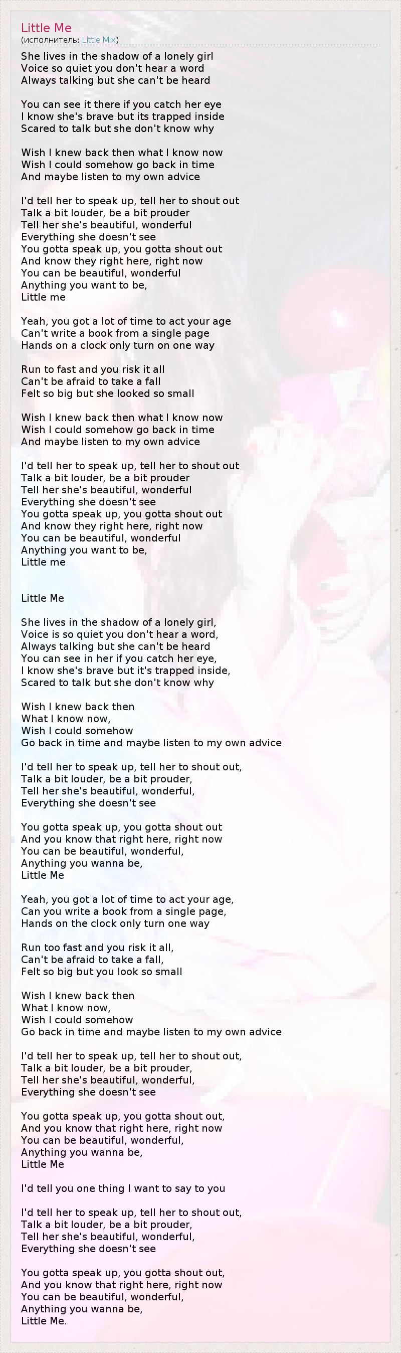 She lives in the shadow of a lonely girl Voice so quiet you don't hear a word Always talking but she can't be heard You can see it there if you catch her eye I know she's brave but its trapped inside Scared to talk but she don't know why Wish I knew back then what I know now Wish I could somehow go back in time And maybe listen to my own advice I'd tell her to speak up, tell her to shout out Talk a bit louder, be a bit prouder Tell her she's beautiful, wonderful Everything she doesn't see You gotta speak up, you gotta shout out And know they right here, right now You can be beautiful, wonderful Anything you want to be, Little me Yeah, you got a lot of time to act your age Can't write a book from a single page Hands on a clock only turn on one way Run to fast and you risk it all Can't be afraid to take a fall Felt so big but she looked so small Wish I knew back then what I know now Wish I could somehow go back in time And maybe listen to my own advice I'd tell her to speak up, tell her to shout out Talk a bit louder, be a bit prouder Tell her she's beautiful, wonderful Everything she doesn't see You gotta speak up, you gotta shout out And know they right here, right now You can be beautiful, wonderful Anything you want to be, Little me Little Me She lives in the shadow of a lonely girl, Voice is so quiet you don't hear a word, Always talking but she can't be heard You can see in her if you catch her eye, I know she's brave but it's trapped inside, Scared to talk but she don't know why Wish I knew back then What I know now, Wish I could somehow Go back in time and maybe listen to my own advice I'd tell her to speak up, tell her to shout out, Talk a bit louder, be a bit prouder, Tell her she's beautiful, wonderful, Everything she doesn't see You gotta speak up, you gotta shout out And you know that right here, right now You can be beautiful, wonderful, Anything you wanna be, Little Me Yeah, you got a lot of time to act your age, Can you write a book from a single page, Hands on the clock only turn one way Run too fast and you risk it all, Can't be afraid to take a fall, Felt so big but you look so small Wish I knew back then What I know now, Wish I could somehow Go back in time and maybe listen to my own advice I'd tell her to speak up, tell her to shout out, Talk a bit louder, be a bit prouder, Tell her she's beautiful, wonderful, Everything she doesn't see You gotta speak up, you gotta shout out, And you know that right here, right now You can be beautiful, wonderful, Anything you wanna be, Little Me I'd tell you one thing I want to say to you I'd tell her to speak up, tell her to shout out, Talk a bit louder, be a bit prouder, Tell her she's beautiful, wonderful, Everything she doesn't see You gotta speak up, you gotta shout out, And you know that right here, right now You can be beautiful, wonderful, Anything you wanna be, Little Me.