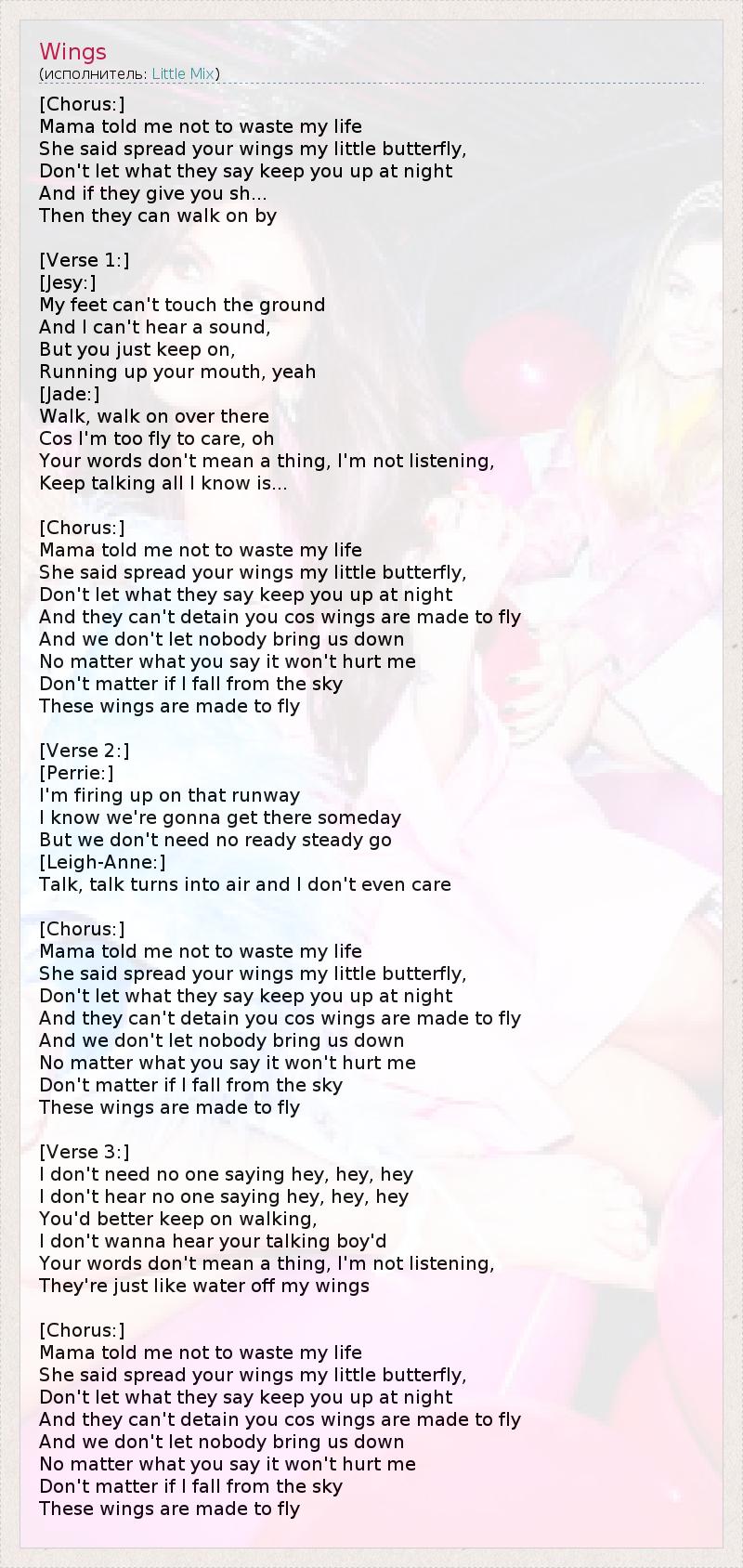 [Припев:] Мама сказала мне: "Не растрачивай свою жизнь впустую, Расправь крылья, моя малышка-бабочка, Не позволяй ничьим разговорам лишить тебя сна. А если злые языки попытаются задеть тебя, Не обращай внимания..." 1 [Куплет 1:] [Jesy:] Мои ноги не касаются земли И я не слышу не звука, Но вы продолжаете Попусту раскрывать свои рты, да! [Jade:] Так идите, идите отсюда, Потому что ваши слова меня не волнуют, да! Ваши слова ничего не значат, я их совершенно не слушаю. Продолжайте говорить, ведь я знаю, что... [Припев:] Мама сказала мне: "Не растрачивай свою жизнь впустую, Расправь крылья, моя малышка-бабочка, Не позволяй ничьим разговорам лишить тебя сна. Они не могут помешать тебе, ведь тебе даны крылья для полета." И мы не позволим никому сломить нас, Что бы вы ни говорили, меня это не ранит. Ведь даже если я упаду с небес, Мне даны крылья для полета... [Куплет 2:] [Perrie:] Я только в начале пути, Я знаю, когда-нибудь мы добьемся многого, Нам не нужны ваши команды: "На старт! Внимание! Марш!" [Leigh-Anne:] Ваша болтовня витает в воздухе, а мне все равно. [Припев:] Мама сказала мне: "Не растрачивай свою жизнь впустую, Расправь крылья, моя малышка-бабочка, Не позволяй ничьим разговорам лишить тебя сна. Они не могут помешать тебе, ведь тебе даны крылья для полета." И мы не позволим никому сломить нас, Что бы вы ни говорили, меня это не ранит. Ведь даже если я упаду с небес, Мне даны крылья для полета... [Куплет 3:] Мне не нужно, чтобы кто-нибудь говорил: "Эй! Эй! Эй!", Я не слышу, когда вы мне говорите: "Эй! Эй! Эй!", Лучше проходи мимо, Я не желаю слушать твою болтовню, парень. Ваши слова ничего не значат, я не слушаю, Они как вода, стекающая с моих крыльев. [Припев:] Мама сказала мне: "Не растрачивай свою жизнь впустую, Расправь крылья, моя малышка-бабочка, Не позволяй ничьим разговорам лишить тебя сна. Они не могут помешать тебе, ведь тебе даны крылья для полета." И мы не позволим никому сломить нас, Что бы вы ни говорили, меня это не ранит. Ведь даже если я упаду с небес, Мне даны крылья для полета... 1 - дословно: То пусть они проходят мимо