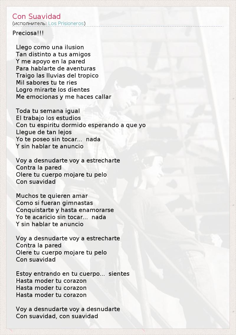 Preciosa!!! Llego como una ilusion Tan distinto a tus amigos Y me apoyo en la pared Para hablarte de aventuras Traigo las lluvias del tropico Mil sabores tu te ries Logro mirarte los dientes Me emocionas y me haces callar Toda tu semana igual El trabajo los estudios Con tu espiritu dormido esperando a que yo Llegue de tan lejos Yo te poseo sin tocar... nada Y sin hablar te anuncio Voy a desnudarte voy a estrecharte Contra la pared Olere tu cuerpo mojare tu pelo Con suavidad Muchos te quieren amar Como si fueran gimnastas Conquistarte y hasta enamorarse Yo te acaricio sin tocar... nada Y sin hablar te anuncio Voy a desnudarte voy a estrecharte Contra la pared Olere tu cuerpo mojare tu pelo Con suavidad Estoy entrando en tu cuerpo... sientes Hasta moder tu corazon Hasta moder tu corazon Hasta moder tu corazon Voy a desnudarte voy a desnudarte Con suavidad, con suavidad