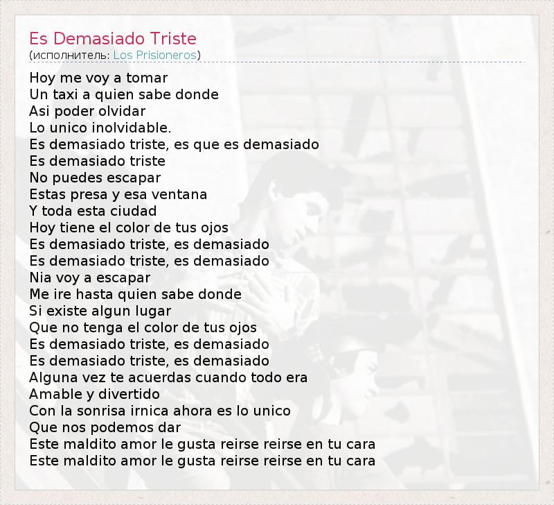 Hoy me voy a tomar Un taxi a quien sabe donde Asi poder olvidar Lo unico inolvidable. Es demasiado triste, es que es demasiado Es demasiado triste No puedes escapar Estas presa y esa ventana Y toda esta ciudad Hoy tiene el color de tus ojos Es demasiado triste, es demasiado Es demasiado triste, es demasiado Nia voy a escapar Me ire hasta quien sabe donde Si existe algun lugar Que no tenga el color de tus ojos Es demasiado triste, es demasiado Es demasiado triste, es demasiado Alguna vez te acuerdas cuando todo era Amable y divertido Con la sonrisa irnica ahora es lo unico Que nos podemos dar Este maldito amor le gusta reirse reirse en tu cara Este maldito amor le gusta reirse reirse en tu cara