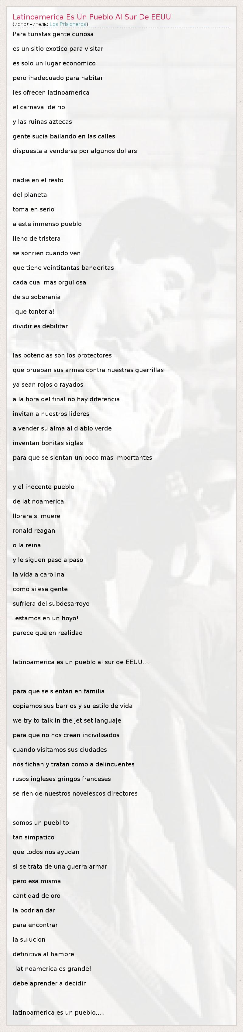 Para turistas gente curiosa es un sitio exotico para visitar es solo un lugar economico pero inadecuado para habitar les ofrecen latinoamerica el carnaval de rio y las ruinas aztecas gente sucia bailando en las calles dispuesta a venderse por algunos dollars nadie en el resto del planeta toma en serio a este inmenso pueblo lleno de tristera se sonrien cuando ven que tiene veintitantas banderitas cada cual mas orgullosa de su soberania ¡que tonteria! dividir es debilitar las potencias son los protectores que prueban sus armas contra nuestras guerrillas ya sean rojos o rayados a la hora del final no hay diferencia invitan a nuestros lideres a vender su alma al diablo verde inventan bonitas siglas para que se sientan un poco mas importantes y el inocente pueblo de latinoamerica llorara si muere ronald reagan o la reina y le siguen paso a paso la vida a carolina como si esa gente sufriera del subdesarroyo ¡estamos en un hoyo! parece que en realidad latinoamerica es un pueblo al sur de EEUU.... para que se sientan en familia copiamos sus barrios y su estilo de vida we try to talk in the jet set languaje para que no nos crean incivilisados cuando visitamos sus ciudades nos fichan y tratan como a delincuentes rusos ingleses gringos franceses se rien de nuestros novelescos directores somos un pueblito tan simpatico que todos nos ayudan si se trata de una guerra armar pero esa misma cantidad de oro la podrian dar para encontrar la sulucion definitiva al hambre ¡latinoamerica es grande! debe aprender a decidir latinoamerica es un pueblo.....