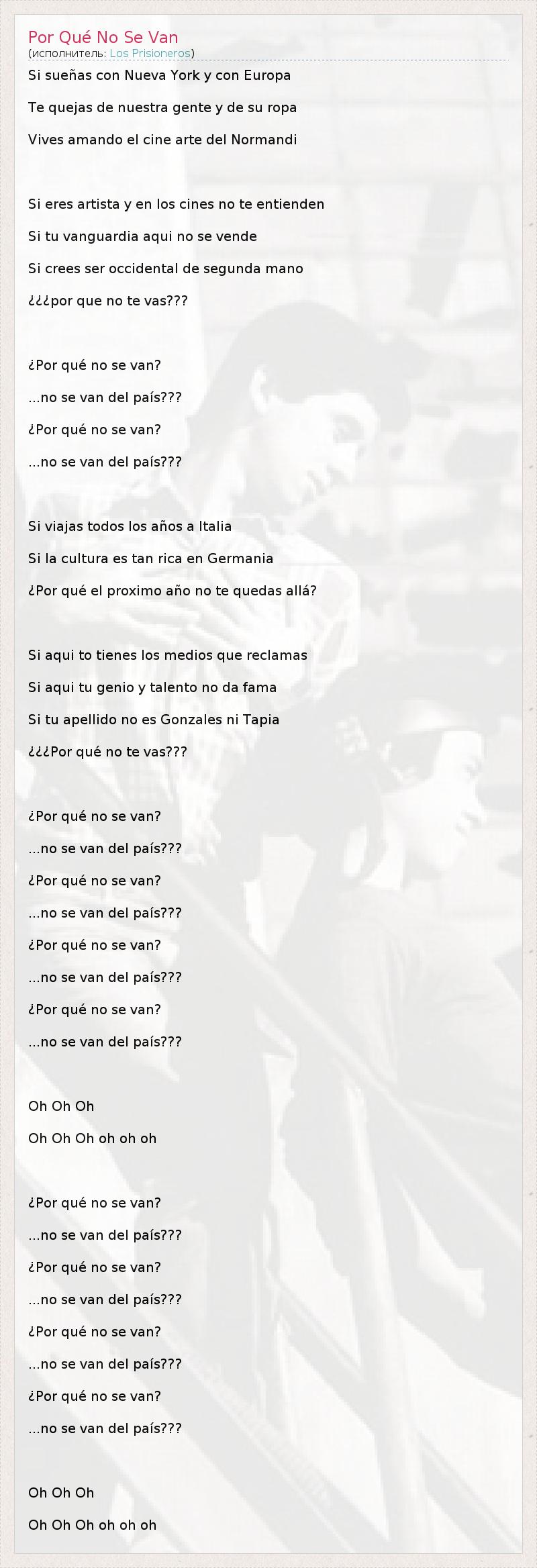 Si sueñas con Nueva York y con Europa Te quejas de nuestra gente y de su ropa Vives amando el cine arte del Normandi Si eres artista y en los cines no te entienden Si tu vanguardia aqui no se vende Si crees ser occidental de segunda mano ¿¿¿por que no te vas??? ¿Por qué no se van? ...no se van del país??? ¿Por qué no se van? ...no se van del país??? Si viajas todos los años a Italia Si la cultura es tan rica en Germania ¿Por qué el proximo año no te quedas allá? Si aqui to tienes los medios que reclamas Si aqui tu genio y talento no da fama Si tu apellido no es Gonzales ni Tapia ¿¿¿Por qué no te vas??? ¿Por qué no se van? ...no se van del país??? ¿Por qué no se van? ...no se van del país??? ¿Por qué no se van? ...no se van del país??? ¿Por qué no se van? ...no se van del país??? Oh Oh Oh Oh Oh Oh oh oh oh ¿Por qué no se van? ...no se van del país??? ¿Por qué no se van? ...no se van del país??? ¿Por qué no se van? ...no se van del país??? ¿Por qué no se van? ...no se van del país??? Oh Oh Oh Oh Oh Oh oh oh oh
