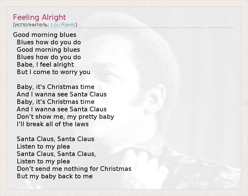 Good morning blues Blues how do you do Good morning blues Blues how do you do Babe, I feel alright But I come to worry you Baby, it's Christmas time And I wanna see Santa Claus Baby, it's Christmas time And I wanna see Santa Claus Don't show me, my pretty baby I'll break all of the laws Santa Claus, Santa Claus Listen to my plea Santa Claus, Santa Claus, Listen to my plea Don't send me nothing for Christmas But my baby back to me