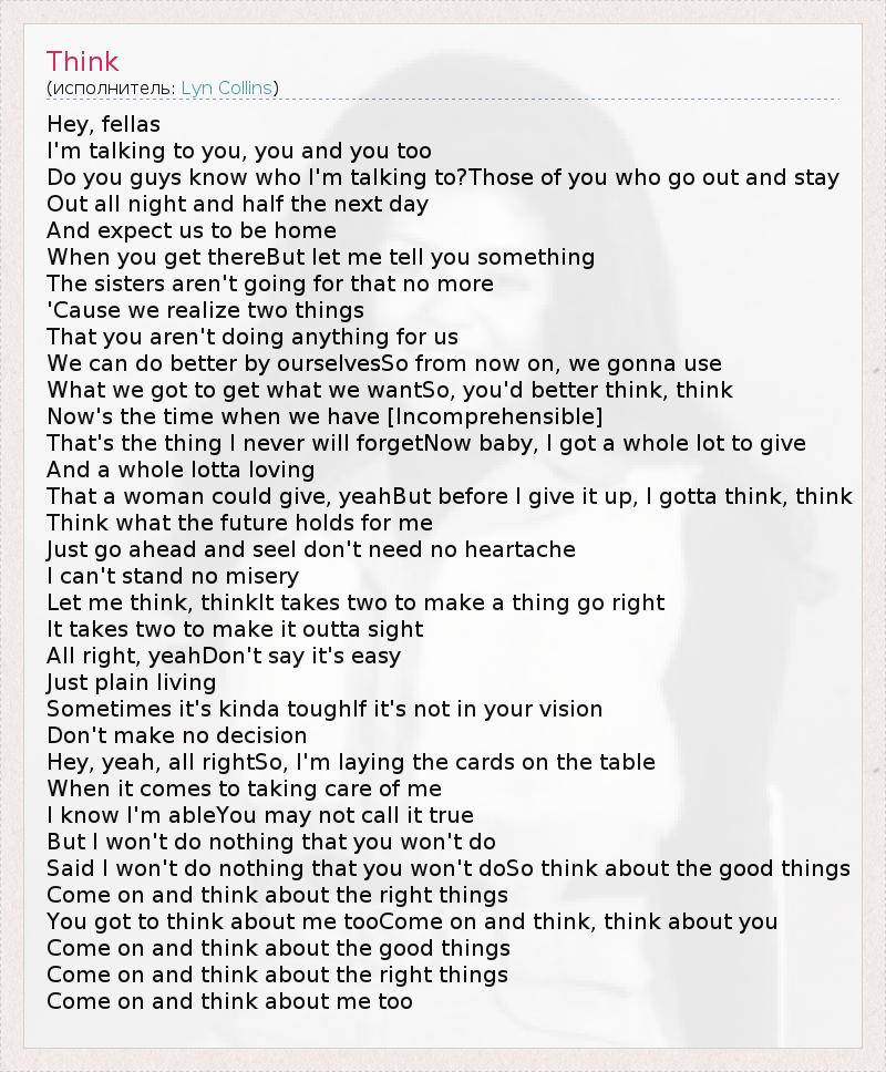 Это интересно:Лин Коллинз (наст. имя Глория Лаверн Коллинз род. 12 июня 1948, Абилин, Техас, США - ум. 13 марта 2005, Пасадина, Калифорния, США) - афро-американская соул-певица, получившая известность благодаря совместной работе с Джеймсом Брауном в 70-е гг., а также влиятельному фанк-хиту 1972 года "Think (About It)". Вопреки распространенному мнению, Лин не имеет никакого отношения к Бутси и Катфиш Коллинз.... продолжение