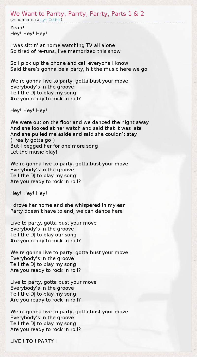 Yeah! Hey! Hey! Hey! I was sittin' at home watching TV all alone So tired of re-runs, I've memorized this show So I pick up the phone and call everyone I know Said there's gonna be a party, hit the music here we go We're gonna live to party, gotta bust your move Everybody's in the groove Tell the DJ to play my song Are you ready to rock 'n roll? Hey! Hey! Hey! We were out on the floor and we danced the night away And she looked at her watch and said that it was late And she pulled me aside and said she couldn't stay (I really gotta go!) But I begged her for one more song Let the music play! We're gonna live to party, gotta bust your move Everybody's in the groove Tell the DJ to play my song Are you ready to rock 'n roll? Hey! Hey! Hey! I drove her home and she whispered in my ear Party doesn't have to end, we can dance here Live to party, gotta bust your move Everybody's in the groove Tell the DJ to play our song Are you ready to rock 'n roll? We're gonna live to party, gotta bust your move Everybody's in the groove Tell the DJ to play my song Are you ready to rock 'n roll? Live to party, gotta bust your move Everybody's in the groove Tell the DJ to play my song Are you ready to rock 'n roll? We're gonna live to party, gotta bust your move Everybody's in the groove Tell the DJ to play my song Are you ready to rock 'n roll? LIVE ! TO ! PARTY !