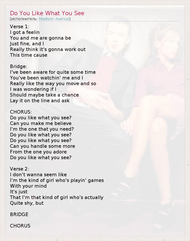Verse 1: I got a feelin You and me are gonna be Just fine, and I Really think it's gonna work out This time cause Bridge: I've been aware for quite some time You've been watchin' me and I Really like the way you move and so I was wondering if I Should maybe take a chance Lay it on the line and ask CHORUS: Do you like what you see? Can you make me believe I'm the one that you need? Do you like what you see? Do you like what you see? Can you handle some more From the one you adore Do you like what you see? Verse 2: I don't wanna seem like I'm the kind of girl who's playin' games With your mind It's just That I'm that kind of girl who's actually Quite shy, but BRIDGE CHORUS