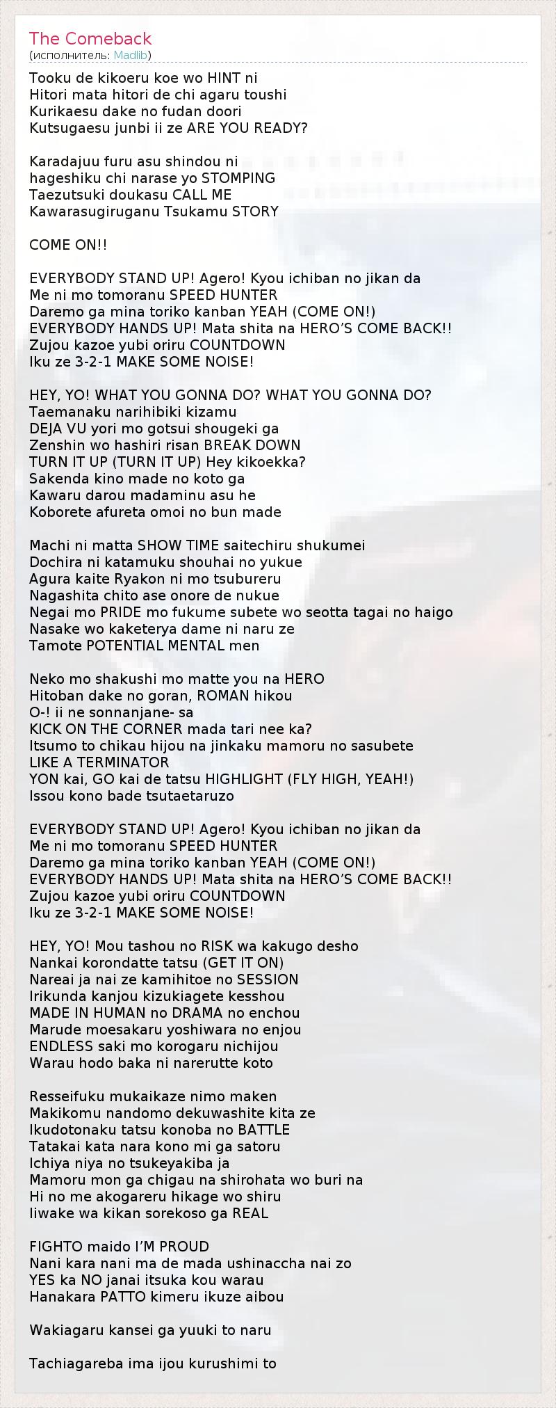 Tooku de kikoeru koe wo HINT ni Hitori mata hitori de chi agaru toushi Kurikaesu dake no fudan doori Kutsugaesu junbi ii ze ARE YOU READY? Karadajuu furu asu shindou ni hageshiku chi narase yo STOMPING Taezutsuki doukasu CALL ME Kawarasugiruganu Tsukamu STORY COME ON!! EVERYBODY STAND UP! Agero! Kyou ichiban no jikan da Me ni mo tomoranu SPEED HUNTER Daremo ga mina toriko kanban YEAH (COME ON!) EVERYBODY HANDS UP! Mata shita na HERO’S COME BACK!! Zujou kazoe yubi oriru COUNTDOWN Iku ze 3-2-1 MAKE SOME NOISE! HEY, YO! WHAT YOU GONNA DO? WHAT YOU GONNA DO? Taemanaku narihibiki kizamu DEJA VU yori mo gotsui shougeki ga Zenshin wo hashiri risan BREAK DOWN TURN IT UP (TURN IT UP) Hey kikoekka? Sakenda kino made no koto ga Kawaru darou madaminu asu he Koborete afureta omoi no bun made Machi ni matta SHOW TIME saitechiru shukumei Dochira ni katamuku shouhai no yukue Agura kaite Ryakon ni mo tsubureru Nagashita chito ase onore de nukue Negai mo PRIDE mo fukume subete wo seotta tagai no haigo Nasake wo kaketerya dame ni naru ze Tamote POTENTIAL MENTAL men Neko mo shakushi mo matte you na HERO Hitoban dake no goran, ROMAN hikou O-! ii ne sonnanjane- sa KICK ON THE CORNER mada tari nee ka? Itsumo to chikau hijou na jinkaku mamoru no sasubete LIKE A TERMINATOR YON kai, GO kai de tatsu HIGHLIGHT (FLY HIGH, YEAH!) Issou kono bade tsutaetaruzo EVERYBODY STAND UP! Agero! Kyou ichiban no jikan da Me ni mo tomoranu SPEED HUNTER Daremo ga mina toriko kanban YEAH (COME ON!) EVERYBODY HANDS UP! Mata shita na HERO’S COME BACK!! Zujou kazoe yubi oriru COUNTDOWN Iku ze 3-2-1 MAKE SOME NOISE! HEY, YO! Mou tashou no RISK wa kakugo desho Nankai korondatte tatsu (GET IT ON) Nareai ja nai ze kamihitoe no SESSION Irikunda kanjou kizukiagete kesshou MADE IN HUMAN no DRAMA no enchou Marude moesakaru yoshiwara no enjou ENDLESS saki mo korogaru nichijou Warau hodo baka ni narerutte koto Resseifuku mukaikaze nimo maken Makikomu nandomo dekuwashite kita ze Ikudotonaku tatsu konoba no BATTLE Tatakai kata nara kono mi ga satoru Ichiya niya no tsukeyakiba ja Mamoru mon ga chigau na shirohata wo buri na Hi no me akogareru hikage wo shiru Iiwake wa kikan sorekoso ga REAL FIGHTO maido I’M PROUD Nani kara nani ma de mada ushinaccha nai zo YES ka NO janai itsuka kou warau Hanakara PATTO kimeru ikuze aibou Wakiagaru kansei ga yuuki to naru Tachiagareba ima ijou kurushimi to