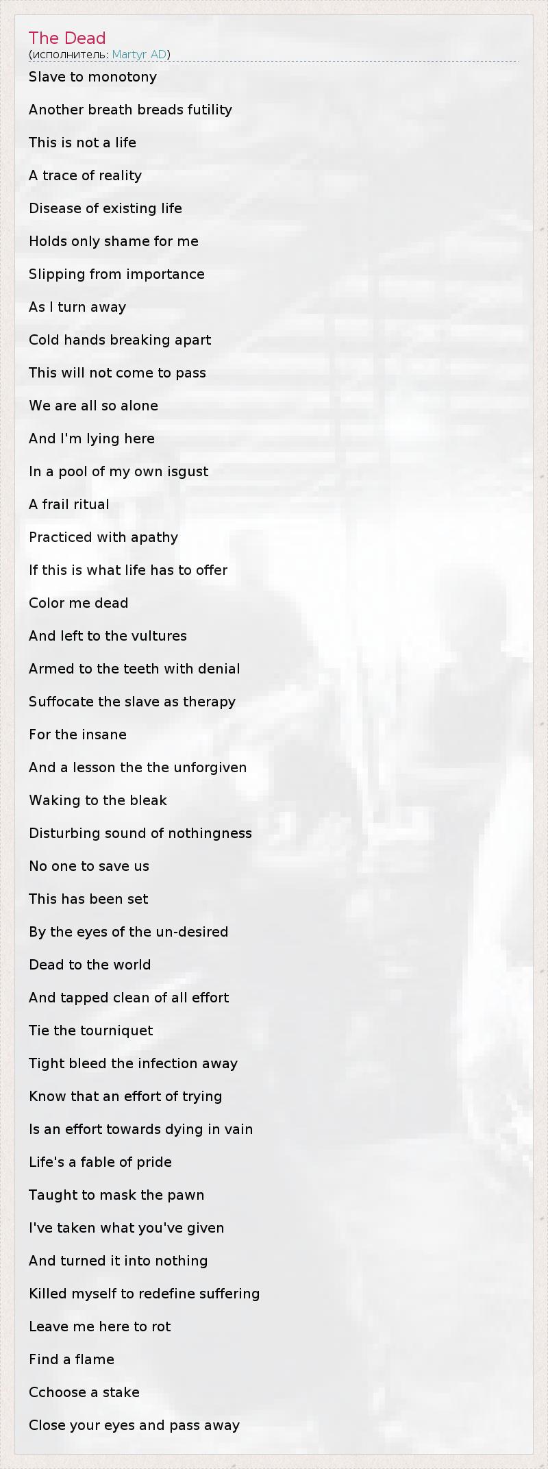 Slave to monotony Another breath breads futility This is not a life A trace of reality Disease of existing life Holds only shame for me Slipping from importance As I turn away Cold hands breaking apart This will not come to pass We are all so alone And I'm lying here In a pool of my own isgust A frail ritual Practiced with apathy If this is what life has to offer Color me dead And left to the vultures Armed to the teeth with denial Suffocate the slave as therapy For the insane And a lesson the the unforgiven Waking to the bleak Disturbing sound of nothingness No one to save us This has been set By the eyes of the un-desired Dead to the world And tapped clean of all effort Tie the tourniquet Tight bleed the infection away Know that an effort of trying Is an effort towards dying in vain Life's a fable of pride Taught to mask the pawn I've taken what you've given And turned it into nothing Killed myself to redefine suffering Leave me here to rot Find a flame Cchoose a stake Close your eyes and pass away