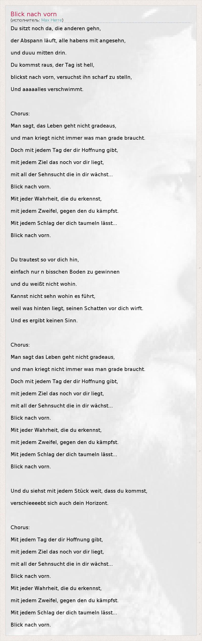 Du sitzt noch da, die anderen gehn, der Abspann läuft, alle habens mit angesehn, und duuu mitten drin. Du kommst raus, der Tag ist hell, blickst nach vorn, versuchst ihn scharf zu stelln, Und aaaaalles verschwimmt. Chorus: Man sagt, das Leben geht nicht gradeaus, und man kriegt nicht immer was man grade braucht. Doch mit jedem Tag der dir Hoffnung gibt, mit jedem Ziel das noch vor dir liegt, mit all der Sehnsucht die in dir wächst... Blick nach vorn. Mit jeder Wahrheit, die du erkennst, mit jedem Zweifel, gegen den du kämpfst. Mit jedem Schlag der dich taumeln lässt... Blick nach vorn. Du trautest so vor dich hin, einfach nur n bisschen Boden zu gewinnen und du weißt nicht wohin. Kannst nicht sehn wohin es führt, weil was hinten liegt, seinen Schatten vor dich wirft. Und es ergibt keinen Sinn. Chorus: Man sagt das Leben geht nicht gradeaus, und man kriegt nicht immer was man grade braucht. Doch mit jedem Tag der dir Hoffnung gibt, mit jedem Ziel das noch vor dir liegt, mit all der Sehnsucht die in dir wächst... Blick nach vorn. Mit jeder Wahrheit, die du erkennst, mit jedem Zweifel, gegen den du kämpfst. Mit jedem Schlag der dich taumeln lässt... Blick nach vorn. Und du siehst mit jedem Stück weit, dass du kommst, verschieeeebt sich auch dein Horizont. Chorus: Mit jedem Tag der dir Hoffnung gibt, mit jedem Ziel das noch vor dir liegt, mit all der Sehnsucht die in dir wächst... Blick nach vorn. Mit jeder Wahrheit, die du erkennst, mit jedem Zweifel, gegen den du kämpfst. Mit jedem Schlag der dich taumeln lässt... Blick nach vorn.
