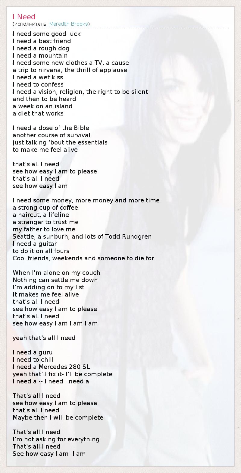 Это интересно:Мередит Брукс родилась в 1958 году в Орегон Сити, штат Орегон, США. После развода родителей вместе с матерью, братом и сестрой они переехали в Корвалис, штат Орегон. В одиннадцатилетнем возрасте Брукс увлеклась игрой на гитаре. Проявив успехи в учебе и сдав несколько классов экстерном она в 15 лет становится выпускницей Corvallis High School. В начале 1980х Брукс выступает в клубах Willamette Valley, Oregon и Washington,... продолжение