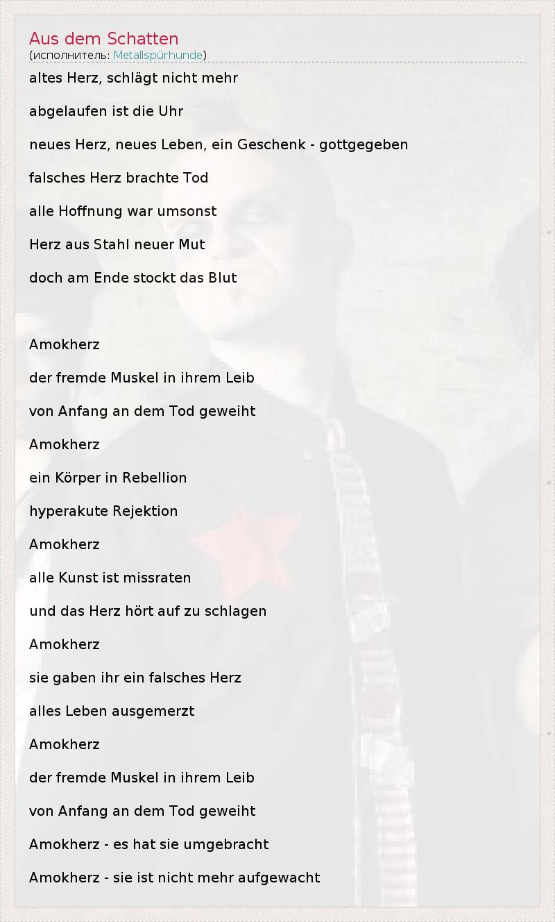 altes Herz, schlägt nicht mehr abgelaufen ist die Uhr neues Herz, neues Leben, ein Geschenk - gottgegeben falsches Herz brachte Tod alle Hoffnung war umsonst Herz aus Stahl neuer Mut doch am Ende stockt das Blut Amokherz der fremde Muskel in ihrem Leib von Anfang an dem Tod geweiht Amokherz ein Körper in Rebellion hyperakute Rejektion Amokherz alle Kunst ist missraten und das Herz hört auf zu schlagen Amokherz sie gaben ihr ein falsches Herz alles Leben ausgemerzt Amokherz der fremde Muskel in ihrem Leib von Anfang an dem Tod geweiht Amokherz - es hat sie umgebracht Amokherz - sie ist nicht mehr aufgewacht