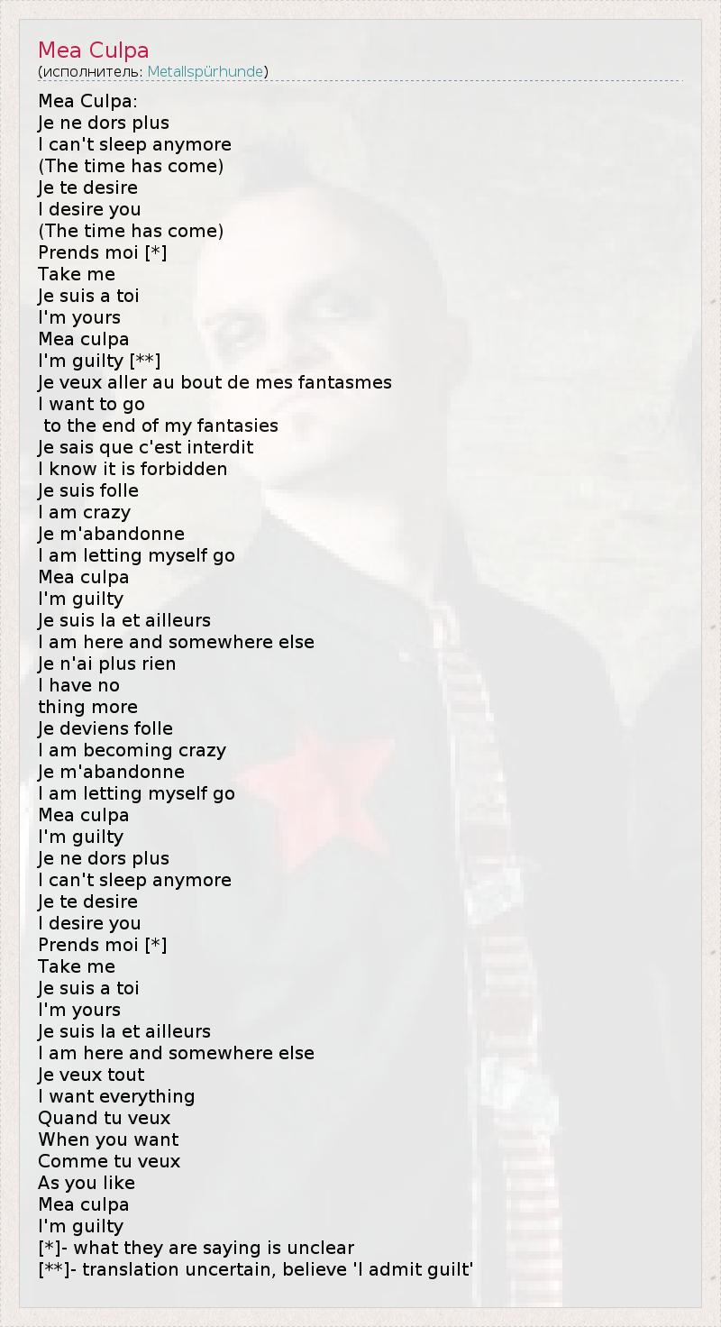 Mea Culpa: Je ne dors plus I can't sleep anymore (The time has come) Je te desire I desire you (The time has come) Prends moi [*] Take me Je suis a toi I'm yours Mea culpa I'm guilty [**] Je veux aller au bout de mes fantasmes I want to go to the end of my fantasies Je sais que c'est interdit I know it is forbidden Je suis folle I am crazy Je m'abandonne I am letting myself go Mea culpa I'm guilty Je suis la et ailleurs I am here and somewhere else Je n'ai plus rien I have no thing more Je deviens folle I am becoming crazy Je m'abandonne I am letting myself go Mea culpa I'm guilty Je ne dors plus I can't sleep anymore Je te desire I desire you Prends moi [*] Take me Je suis a toi I'm yours Je suis la et ailleurs I am here and somewhere else Je veux tout I want everything Quand tu veux When you want Comme tu veux As you like Mea culpa I'm guilty [*]- what they are saying is unclear [**]- translation uncertain, believe 'I admit guilt'