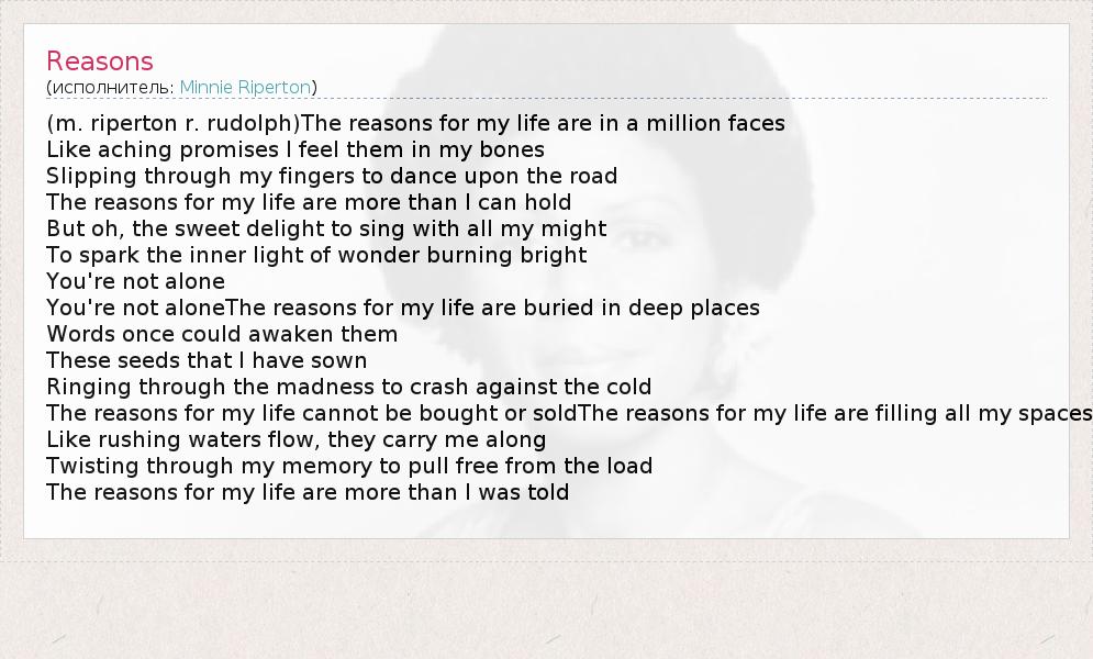 (m. riperton r. rudolph)The reasons for my life are in a million faces Like aching promises I feel them in my bones Slipping through my fingers to dance upon the road The reasons for my life are more than I can hold But oh, the sweet delight to sing with all my might To spark the inner light of wonder burning bright You're not alone You're not aloneThe reasons for my life are buried in deep places Words once could awaken them These seeds that I have sown Ringing through the madness to crash against the cold The reasons for my life cannot be bought or soldThe reasons for my life are filling all my spaces Like rushing waters flow, they carry me along Twisting through my memory to pull free from the load The reasons for my life are more than I was told