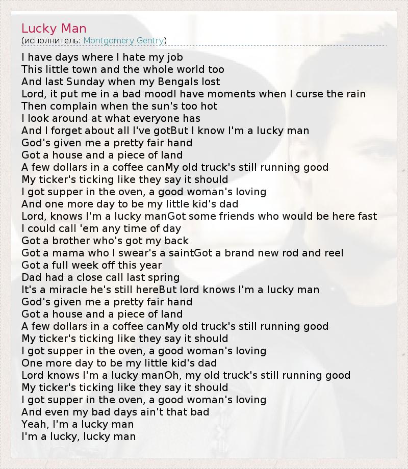 I have days where I hate my job This little town and the whole world too And last Sunday when my Bengals lost Lord, it put me in a bad moodI have moments when I curse the rain Then complain when the sun's too hot I look around at what everyone has And I forget about all I've gotBut I know I'm a lucky man God's given me a pretty fair hand Got a house and a piece of land A few dollars in a coffee canMy old truck's still running good My ticker's ticking like they say it should I got supper in the oven, a good woman's loving And one more day to be my little kid's dad Lord, knows I'm a lucky manGot some friends who would be here fast I could call 'em any time of day Got a brother who's got my back Got a mama who I swear's a saintGot a brand new rod and reel Got a full week off this year Dad had a close call last spring It's a miracle he's still hereBut lord knows I'm a lucky man God's given me a pretty fair hand Got a house and a piece of land A few dollars in a coffee canMy old truck's still running good My ticker's ticking like they say it should I got supper in the oven, a good woman's loving One more day to be my little kid's dad Lord knows I'm a lucky manOh, my old truck's still running good My ticker's ticking like they say it should I got supper in the oven, a good woman's loving And even my bad days ain't that bad Yeah, I'm a lucky man I'm a lucky, lucky man
