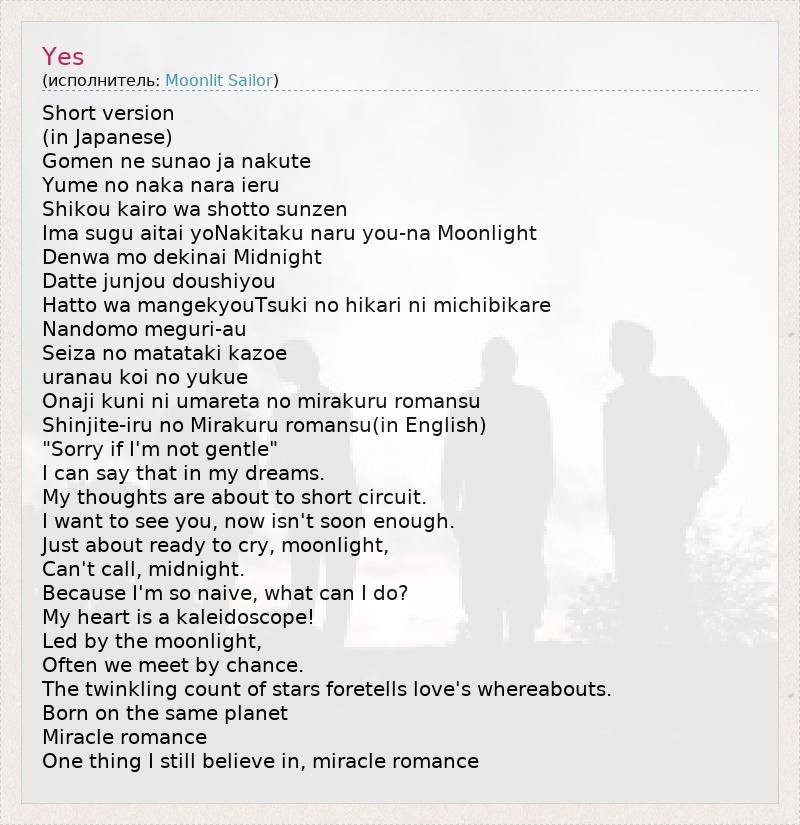 Short version (in Japanese) Gomen ne sunao ja nakute Yume no naka nara ieru Shikou kairo wa shotto sunzen Ima sugu aitai yoNakitaku naru you-na Moonlight Denwa mo dekinai Midnight Datte junjou doushiyou Hatto wa mangekyouTsuki no hikari ni michibikare Nandomo meguri-au Seiza no matataki kazoe uranau koi no yukue Onaji kuni ni umareta no mirakuru romansu Shinjite-iru no Mirakuru romansu(in English) "Sorry if I'm not gentle" I can say that in my dreams. My thoughts are about to short circuit. I want to see you, now isn't soon enough. Just about ready to cry, moonlight, Can't call, midnight. Because I'm so naive, what can I do? My heart is a kaleidoscope! Led by the moonlight, Often we meet by chance. The twinkling count of stars foretells love's whereabouts. Born on the same planet Miracle romance One thing I still believe in, miracle romance