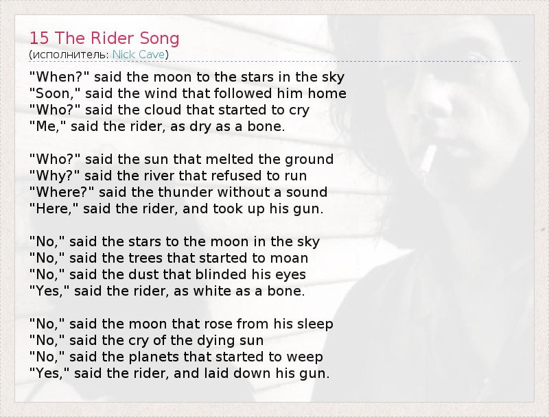 А как ты думаешь, о чем песня "15 The Rider Song" ?