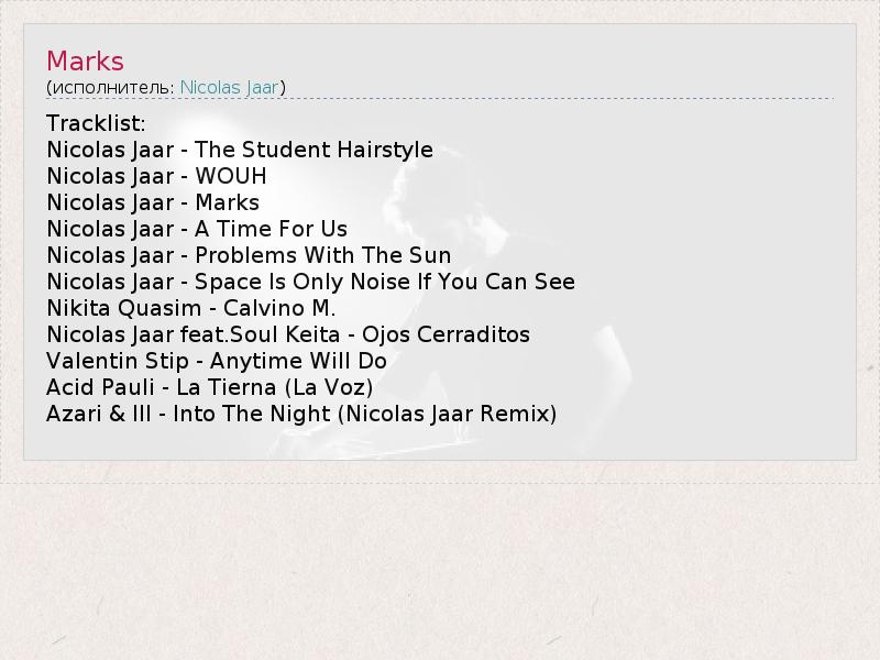 Это интересно:Николас Жаар (Nicolas Jaar) родился в Нью-Йорке, но в скором времени его родители переехали Сантьяго (Чили). На родину Николас вернулся в середине 90-х. Находя прибежище в музыке эфиопского музыканта и аранжировщика Мулату Астатке (Mulatu Astatke) и в творениях созданных французским пианистом Эриком Сати (Erik Satie), в 2004 году Нико, в возрасте 14 лет, начинает делать инструментальную электронную музыку. Когда... продолжение