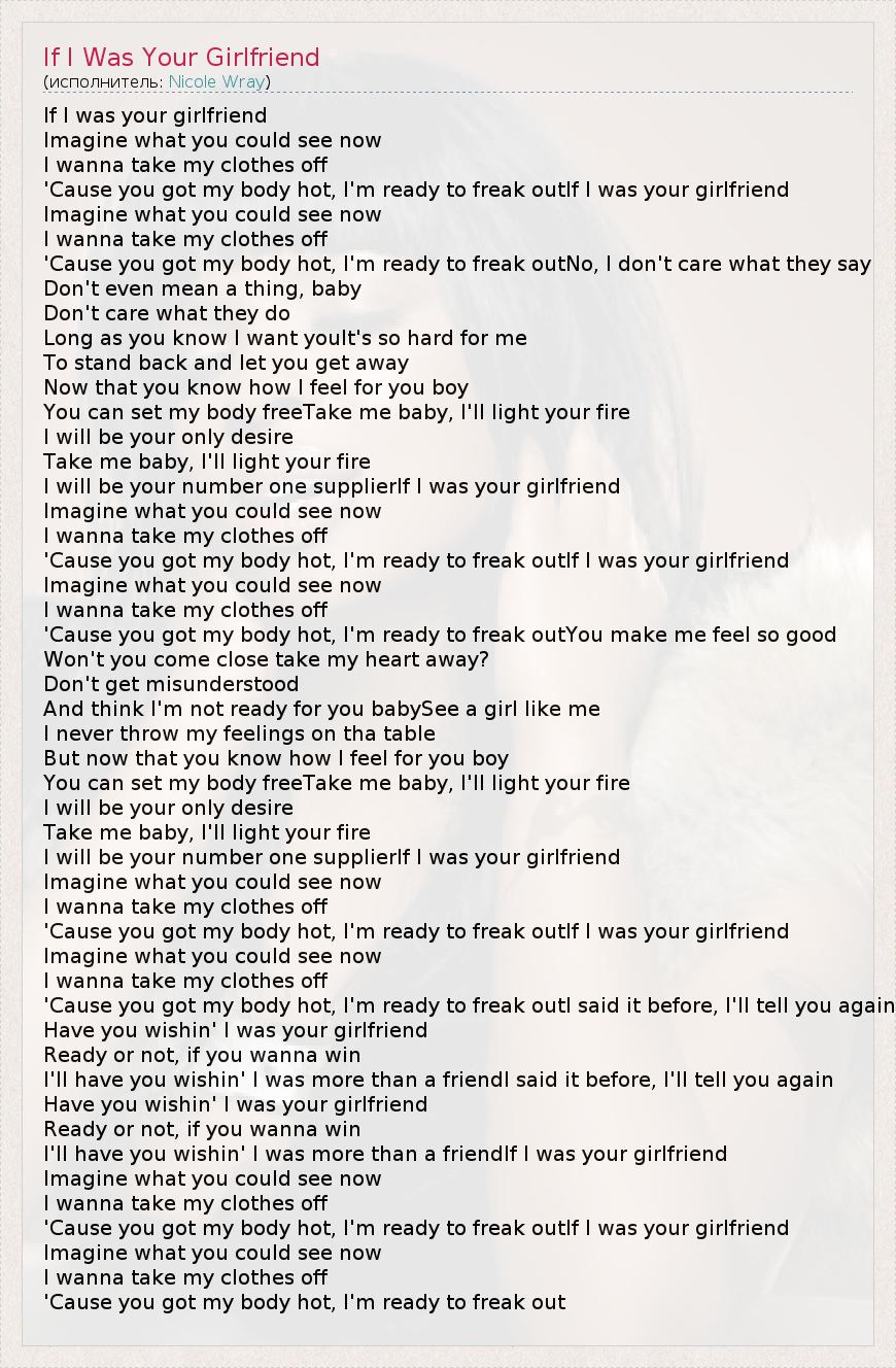 If I was your girlfriend Imagine what you could see now I wanna take my clothes off 'Cause you got my body hot, I'm ready to freak outIf I was your girlfriend Imagine what you could see now I wanna take my clothes off 'Cause you got my body hot, I'm ready to freak outNo, I don't care what they say Don't even mean a thing, baby Don't care what they do Long as you know I want youIt's so hard for me To stand back and let you get away Now that you know how I feel for you boy You can set my body freeTake me baby, I'll light your fire I will be your only desire Take me baby, I'll light your fire I will be your number one supplierIf I was your girlfriend Imagine what you could see now I wanna take my clothes off 'Cause you got my body hot, I'm ready to freak outIf I was your girlfriend Imagine what you could see now I wanna take my clothes off 'Cause you got my body hot, I'm ready to freak outYou make me feel so good Won't you come close take my heart away? Don't get misunderstood And think I'm not ready for you babySee a girl like me I never throw my feelings on tha table But now that you know how I feel for you boy You can set my body freeTake me baby, I'll light your fire I will be your only desire Take me baby, I'll light your fire I will be your number one supplierIf I was your girlfriend Imagine what you could see now I wanna take my clothes off 'Cause you got my body hot, I'm ready to freak outIf I was your girlfriend Imagine what you could see now I wanna take my clothes off 'Cause you got my body hot, I'm ready to freak outI said it before, I'll tell you again Have you wishin' I was your girlfriend Ready or not, if you wanna win I'll have you wishin' I was more than a friendI said it before, I'll tell you again Have you wishin' I was your girlfriend Ready or not, if you wanna win I'll have you wishin' I was more than a friendIf I was your girlfriend Imagine what you could see now I wanna take my clothes off 'Cause you got my body hot, I'm ready to freak outIf I was your girlfriend Imagine what you could see now I wanna take my clothes off 'Cause you got my body hot, I'm ready to freak out