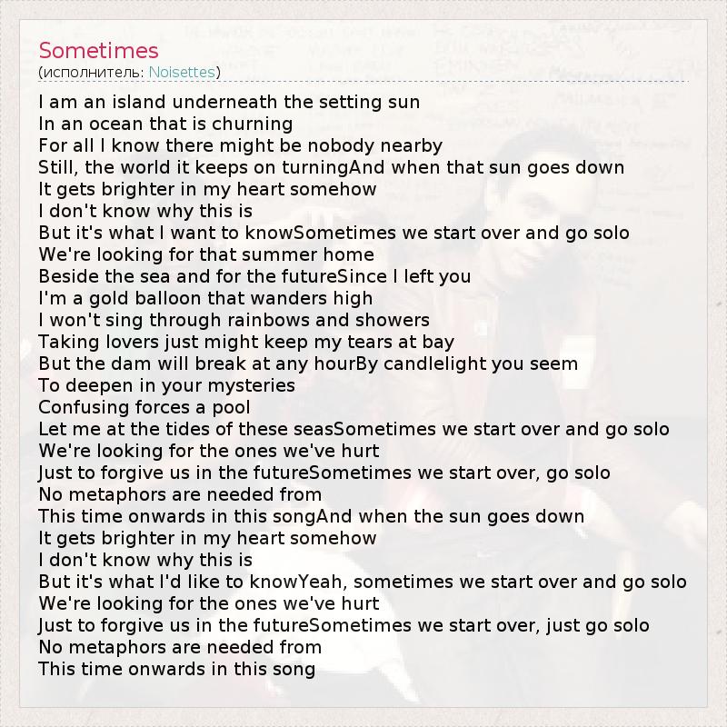 I am an island underneath the setting sun In an ocean that is churning For all I know there might be nobody nearby Still, the world it keeps on turningAnd when that sun goes down It gets brighter in my heart somehow I don't know why this is But it's what I want to knowSometimes we start over and go solo We're looking for that summer home Beside the sea and for the futureSince I left you I'm a gold balloon that wanders high I won't sing through rainbows and showers Taking lovers just might keep my tears at bay But the dam will break at any hourBy candlelight you seem To deepen in your mysteries Confusing forces a pool Let me at the tides of these seasSometimes we start over and go solo We're looking for the ones we've hurt Just to forgive us in the futureSometimes we start over, go solo No metaphors are needed from This time onwards in this songAnd when the sun goes down It gets brighter in my heart somehow I don't know why this is But it's what I'd like to knowYeah, sometimes we start over and go solo We're looking for the ones we've hurt Just to forgive us in the futureSometimes we start over, just go solo No metaphors are needed from This time onwards in this song