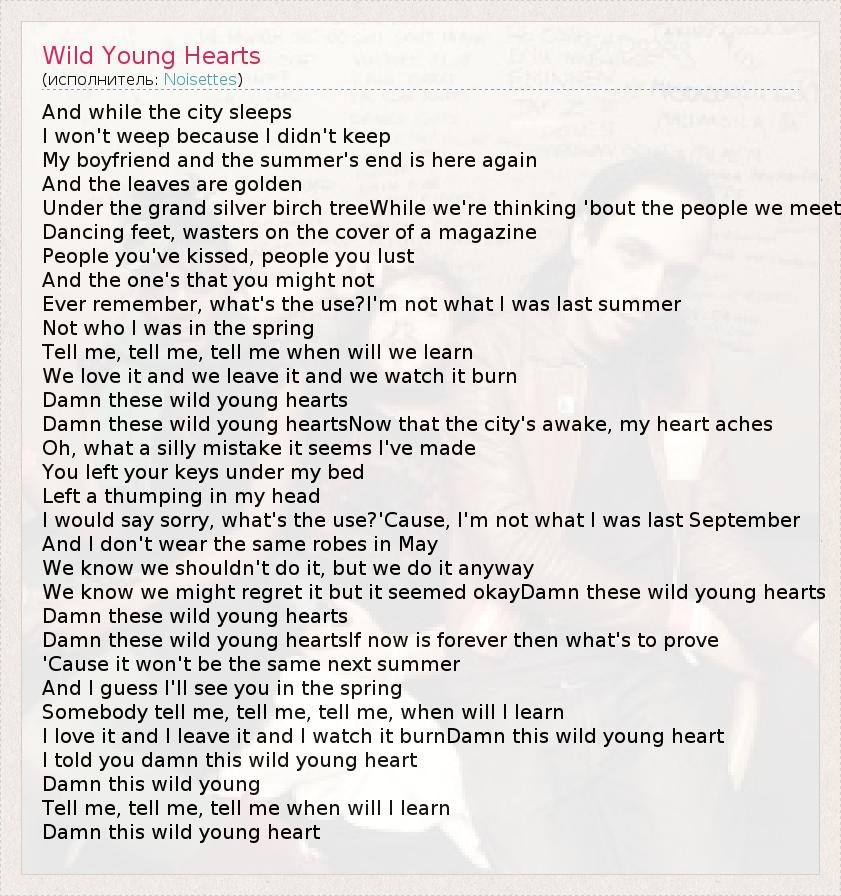 And while the city sleeps I won't weep because I didn't keep My boyfriend and the summer's end is here again And the leaves are golden Under the grand silver birch treeWhile we're thinking 'bout the people we meet Dancing feet, wasters on the cover of a magazine People you've kissed, people you lust And the one's that you might not Ever remember, what's the use?I'm not what I was last summer Not who I was in the spring Tell me, tell me, tell me when will we learn We love it and we leave it and we watch it burn Damn these wild young hearts Damn these wild young heartsNow that the city's awake, my heart aches Oh, what a silly mistake it seems I've made You left your keys under my bed Left a thumping in my head I would say sorry, what's the use?'Cause, I'm not what I was last September And I don't wear the same robes in May We know we shouldn't do it, but we do it anyway We know we might regret it but it seemed okayDamn these wild young hearts Damn these wild young hearts Damn these wild young heartsIf now is forever then what's to prove 'Cause it won't be the same next summer And I guess I'll see you in the spring Somebody tell me, tell me, tell me, when will I learn I love it and I leave it and I watch it burnDamn this wild young heart I told you damn this wild young heart Damn this wild young Tell me, tell me, tell me when will I learn Damn this wild young heart