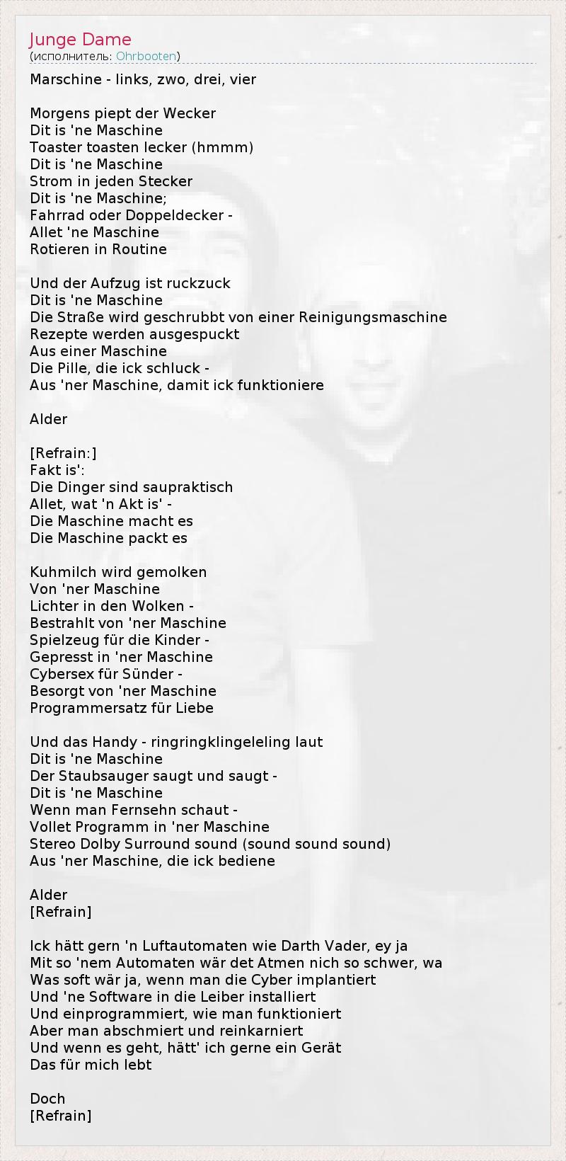 Marschine - links, zwo, drei, vier Morgens piept der Wecker Dit is 'ne Maschine Toaster toasten lecker (hmmm) Dit is 'ne Maschine Strom in jeden Stecker Dit is 'ne Maschine; Fahrrad oder Doppeldecker - Allet 'ne Maschine Rotieren in Routine Und der Aufzug ist ruckzuck Dit is 'ne Maschine Die Straße wird geschrubbt von einer Reinigungsmaschine Rezepte werden ausgespuckt Aus einer Maschine Die Pille, die ick schluck - Aus 'ner Maschine, damit ick funktioniere Alder [Refrain:] Fakt is': Die Dinger sind saupraktisch Allet, wat 'n Akt is' - Die Maschine macht es Die Maschine packt es Kuhmilch wird gemolken Von 'ner Maschine Lichter in den Wolken - Bestrahlt von 'ner Maschine Spielzeug für die Kinder - Gepresst in 'ner Maschine Cybersex für Sünder - Besorgt von 'ner Maschine Programmersatz für Liebe Und das Handy - ringringklingeleling laut Dit is 'ne Maschine Der Staubsauger saugt und saugt - Dit is 'ne Maschine Wenn man Fernsehn schaut - Vollet Programm in 'ner Maschine Stereo Dolby Surround sound (sound sound sound) Aus 'ner Maschine, die ick bediene Alder [Refrain] Ick hätt gern 'n Luftautomaten wie Darth Vader, ey ja Mit so 'nem Automaten wär det Atmen nich so schwer, wa Was soft wär ja, wenn man die Cyber implantiert Und 'ne Software in die Leiber installiert Und einprogrammiert, wie man funktioniert Aber man abschmiert und reinkarniert Und wenn es geht, hätt' ich gerne ein Gerät Das für mich lebt Doch [Refrain]