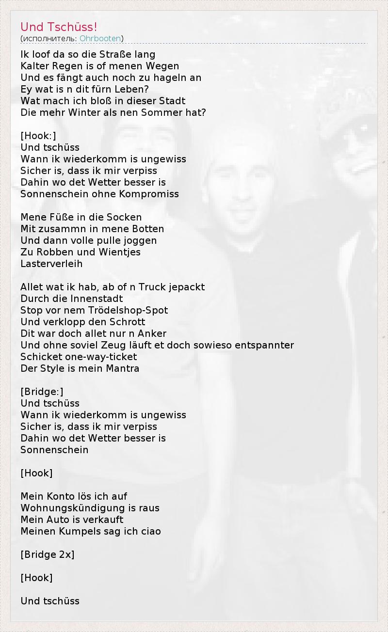 Ik loof da so die Straße lang Kalter Regen is of menen Wegen Und es fängt auch noch zu hageln an Ey wat is n dit fürn Leben? Wat mach ich bloß in dieser Stadt Die mehr Winter als nen Sommer hat? [Hook:] Und tschüss Wann ik wiederkomm is ungewiss Sicher is, dass ik mir verpiss Dahin wo det Wetter besser is Sonnenschein ohne Kompromiss Mene Füße in die Socken Mit zusammn in mene Botten Und dann volle pulle joggen Zu Robben und Wientjes Lasterverleih Allet wat ik hab, ab of n Truck jepackt Durch die Innenstadt Stop vor nem Trödelshop-Spot Und verklopp den Schrott Dit war doch allet nur n Anker Und ohne soviel Zeug läuft et doch sowieso entspannter Schicket one-way-ticket Der Style is mein Mantra [Bridge:] Und tschüss Wann ik wiederkomm is ungewiss Sicher is, dass ik mir verpiss Dahin wo det Wetter besser is Sonnenschein [Hook] Mein Konto lös ich auf Wohnungskündigung is raus Mein Auto is verkauft Meinen Kumpels sag ich ciao [Bridge 2x] [Hook] Und tschüss