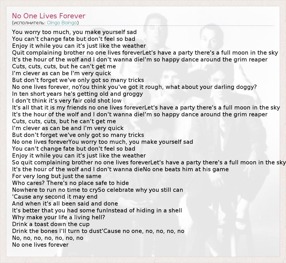 А как ты думаешь, о чем песня "No One Lives Forever" ?