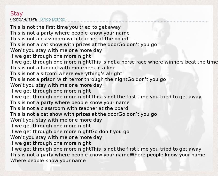This is not the first time you tried to get away This is not a party where people know your name This is not a classroom with teacher at the board This is not a cat show with prizes at the doorGo don't you go Won't you stay with me one more day If we get through one more night If we get through one more nightThis is not a horse race where winners beat the time This is not a funeral with mourners in a line This is not a sitcom where everything's alright This is not a prison with terror through the nightGo don't you go Won't you stay with me one more day If we get through one more night If we get through one more nightThis is not the first time you tried to get away This is not a party where people know your name This is not a classroom with teacher at the board This is not a cat show with prizes at the doorGo don't you go Won't you stay with me one more day If we get through one more night If we get through one more nightGo don't you go Won't you stay with me one more day If we get through one more night If we get through one more nightThis is not the first time you tried to get away This is not a party where people know your nameWhere people know your name Where people know your name