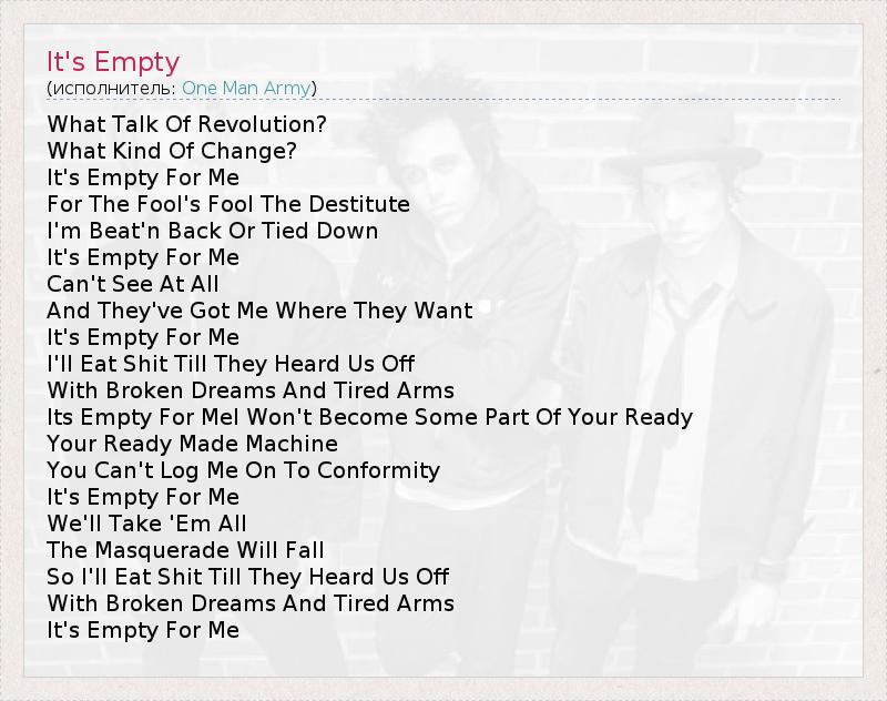 What Talk Of Revolution? What Kind Of Change? It's Empty For Me For The Fool's Fool The Destitute I'm Beat'n Back Or Tied Down It's Empty For Me Can't See At All And They've Got Me Where They Want It's Empty For Me I'll Eat Shit Till They Heard Us Off With Broken Dreams And Tired Arms Its Empty For MeI Won't Become Some Part Of Your Ready Your Ready Made Machine You Can't Log Me On To Conformity It's Empty For Me We'll Take 'Em All The Masquerade Will Fall So I'll Eat Shit Till They Heard Us Off With Broken Dreams And Tired Arms It's Empty For Me
