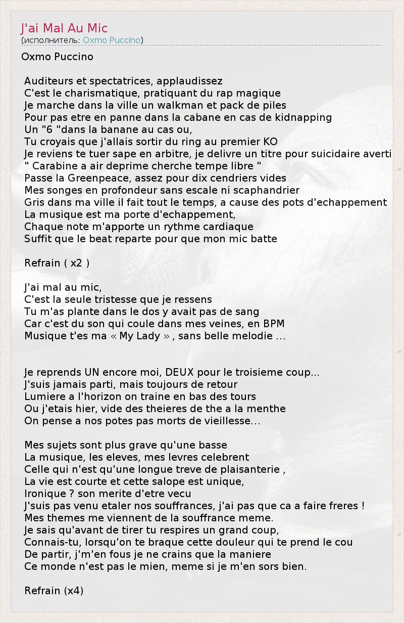 Oxmo Puccino Auditeurs et spectatrices, applaudissez C'est le charismatique, pratiquant du rap magique Je marche dans la ville un walkman et pack de piles Pour pas etre en panne dans la cabane en cas de kidnapping Un "6 "dans la banane au cas ou, Tu croyais que j'allais sortir du ring au premier KO Je reviens te tuer sape en arbitre, je delivre un titre pour suicidaire averti " Carabine a air deprime cherche tempe libre " Passe la Greenpeace, assez pour dix cendriers vides Mes songes en profondeur sans escale ni scaphandrier Gris dans ma ville il fait tout le temps, a cause des pots d'echappement La musique est ma porte d'echappement, Chaque note m'apporte un rythme cardiaque Suffit que le beat reparte pour que mon mic batte Refrain ( x2 ) J'ai mal au mic, C'est la seule tristesse que je ressens Tu m'as plante dans le dos y avait pas de sang Car c'est du son qui coule dans mes veines, en BPM Musique t'es ma « My Lady » , sans belle melodie … Je reprends UN encore moi, DEUX pour le troisieme coup... J'suis jamais parti, mais toujours de retour Lumiere a l'horizon on traine en bas des tours Ou j'etais hier, vide des theieres de the a la menthe On pense a nos potes pas morts de vieillesse… Mes sujets sont plus grave qu'une basse La musique, les eleves, mes levres celebrent Celle qui n'est qu'une longue treve de plaisanterie , La vie est courte et cette salope est unique, Ironique ? son merite d'etre vecu J'suis pas venu etaler nos souffrances, j'ai pas que ca a faire freres ! Mes themes me viennent de la souffrance meme. Je sais qu'avant de tirer tu respires un grand coup, Connais-tu, lorsqu'on te braque cette douleur qui te prend le cou De partir, j'm'en fous je ne crains que la maniere Ce monde n'est pas le mien, meme si je m'en sors bien. Refrain (x4)