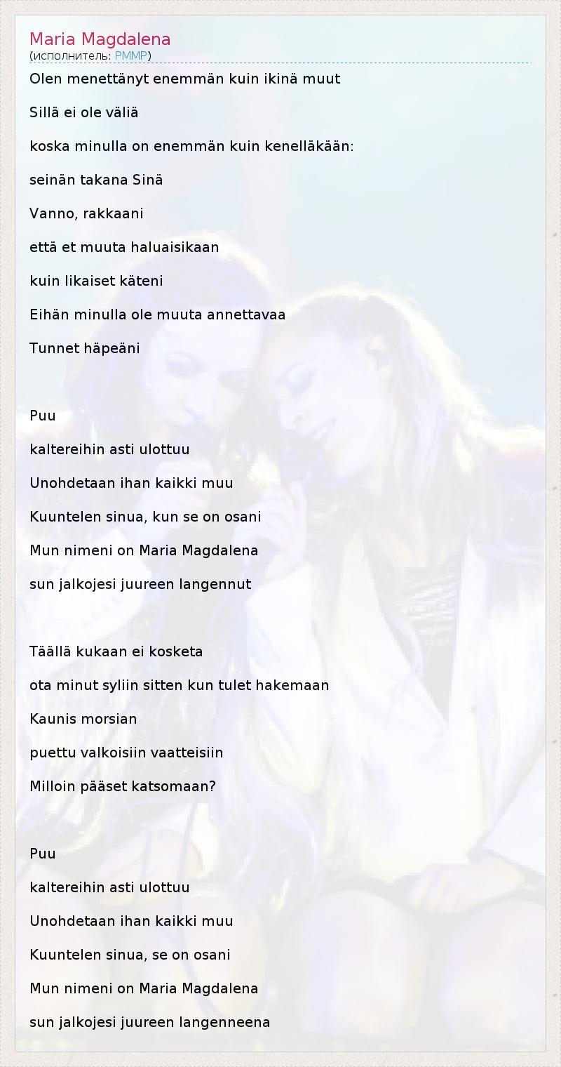 Olen menettänyt enemmän kuin ikinä muut Sillä ei ole väliä koska minulla on enemmän kuin kenelläkään: seinän takana Sinä Vanno, rakkaani että et muuta haluaisikaan kuin likaiset käteni Eihän minulla ole muuta annettavaa Tunnet häpeäni Puu kaltereihin asti ulottuu Unohdetaan ihan kaikki muu Kuuntelen sinua, kun se on osani Mun nimeni on Maria Magdalena sun jalkojesi juureen langennut Täällä kukaan ei kosketa ota minut syliin sitten kun tulet hakemaan Kaunis morsian puettu valkoisiin vaatteisiin Milloin pääset katsomaan? Puu kaltereihin asti ulottuu Unohdetaan ihan kaikki muu Kuuntelen sinua, se on osani Mun nimeni on Maria Magdalena sun jalkojesi juureen langenneena