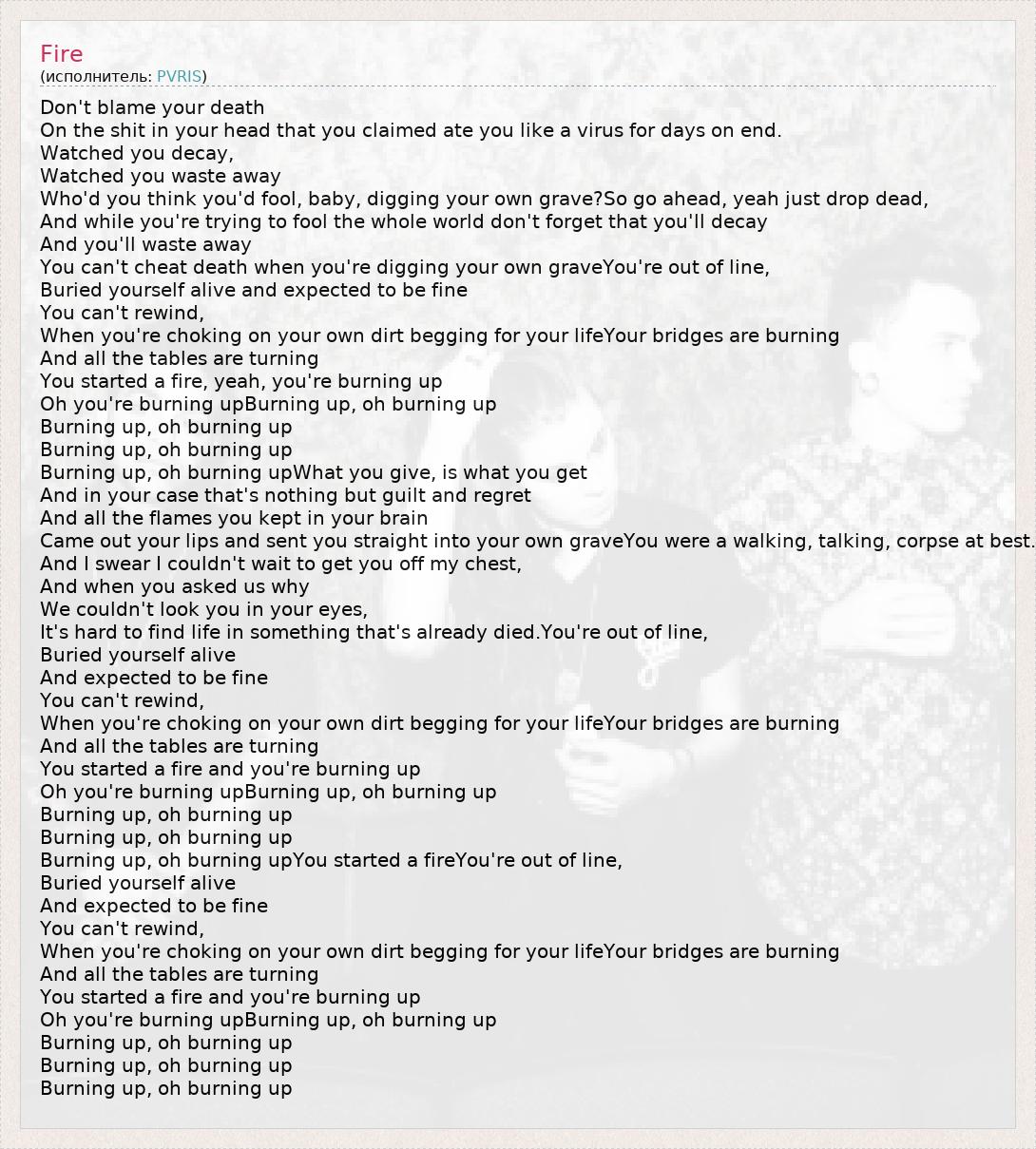 Don't blame your death On the shit in your head that you claimed ate you like a virus for days on end. Watched you decay, Watched you waste away Who'd you think you'd fool, baby, digging your own grave?So go ahead, yeah just drop dead, And while you're trying to fool the whole world don't forget that you'll decay And you'll waste away You can't cheat death when you're digging your own graveYou're out of line, Buried yourself alive and expected to be fine You can't rewind, When you're choking on your own dirt begging for your lifeYour bridges are burning And all the tables are turning You started a fire, yeah, you're burning up Oh you're burning upBurning up, oh burning up Burning up, oh burning up Burning up, oh burning up Burning up, oh burning upWhat you give, is what you get And in your case that's nothing but guilt and regret And all the flames you kept in your brain Came out your lips and sent you straight into your own graveYou were a walking, talking, corpse at best. And I swear I couldn't wait to get you off my chest, And when you asked us why We couldn't look you in your eyes, It's hard to find life in something that's already died.You're out of line, Buried yourself alive And expected to be fine You can't rewind, When you're choking on your own dirt begging for your lifeYour bridges are burning And all the tables are turning You started a fire and you're burning up Oh you're burning upBurning up, oh burning up Burning up, oh burning up Burning up, oh burning up Burning up, oh burning upYou started a fireYou're out of line, Buried yourself alive And expected to be fine You can't rewind, When you're choking on your own dirt begging for your lifeYour bridges are burning And all the tables are turning You started a fire and you're burning up Oh you're burning upBurning up, oh burning up Burning up, oh burning up Burning up, oh burning up Burning up, oh burning up