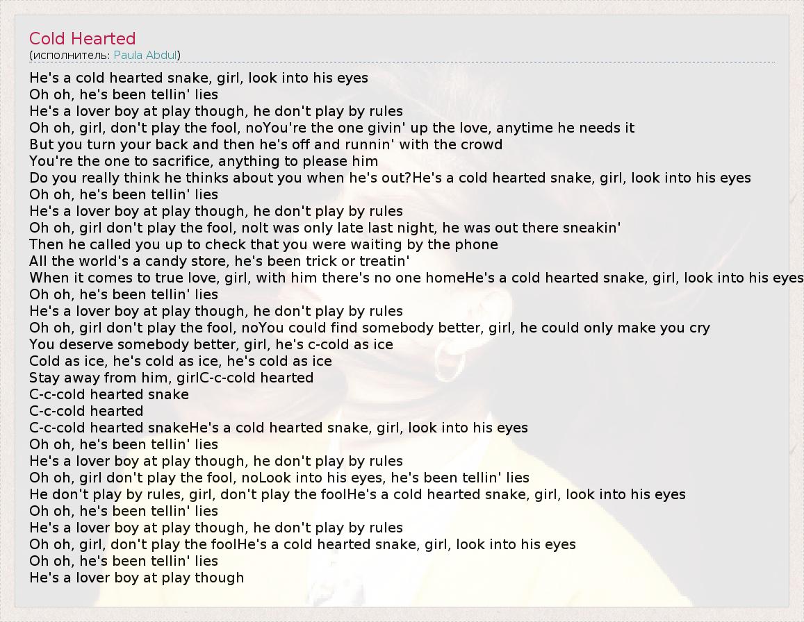 He's a cold hearted snake, girl, look into his eyes Oh oh, he's been tellin' lies He's a lover boy at play though, he don't play by rules Oh oh, girl, don't play the fool, noYou're the one givin' up the love, anytime he needs it But you turn your back and then he's off and runnin' with the crowd You're the one to sacrifice, anything to please him Do you really think he thinks about you when he's out?He's a cold hearted snake, girl, look into his eyes Oh oh, he's been tellin' lies He's a lover boy at play though, he don't play by rules Oh oh, girl don't play the fool, noIt was only late last night, he was out there sneakin' Then he called you up to check that you were waiting by the phone All the world's a candy store, he's been trick or treatin' When it comes to true love, girl, with him there's no one homeHe's a cold hearted snake, girl, look into his eyes Oh oh, he's been tellin' lies He's a lover boy at play though, he don't play by rules Oh oh, girl don't play the fool, noYou could find somebody better, girl, he could only make you cry You deserve somebody better, girl, he's c-cold as ice Cold as ice, he's cold as ice, he's cold as ice Stay away from him, girlC-c-cold hearted C-c-cold hearted snake C-c-cold hearted C-c-cold hearted snakeHe's a cold hearted snake, girl, look into his eyes Oh oh, he's been tellin' lies He's a lover boy at play though, he don't play by rules Oh oh, girl don't play the fool, noLook into his eyes, he's been tellin' lies He don't play by rules, girl, don't play the foolHe's a cold hearted snake, girl, look into his eyes Oh oh, he's been tellin' lies He's a lover boy at play though, he don't play by rules Oh oh, girl, don't play the foolHe's a cold hearted snake, girl, look into his eyes Oh oh, he's been tellin' lies He's a lover boy at play though