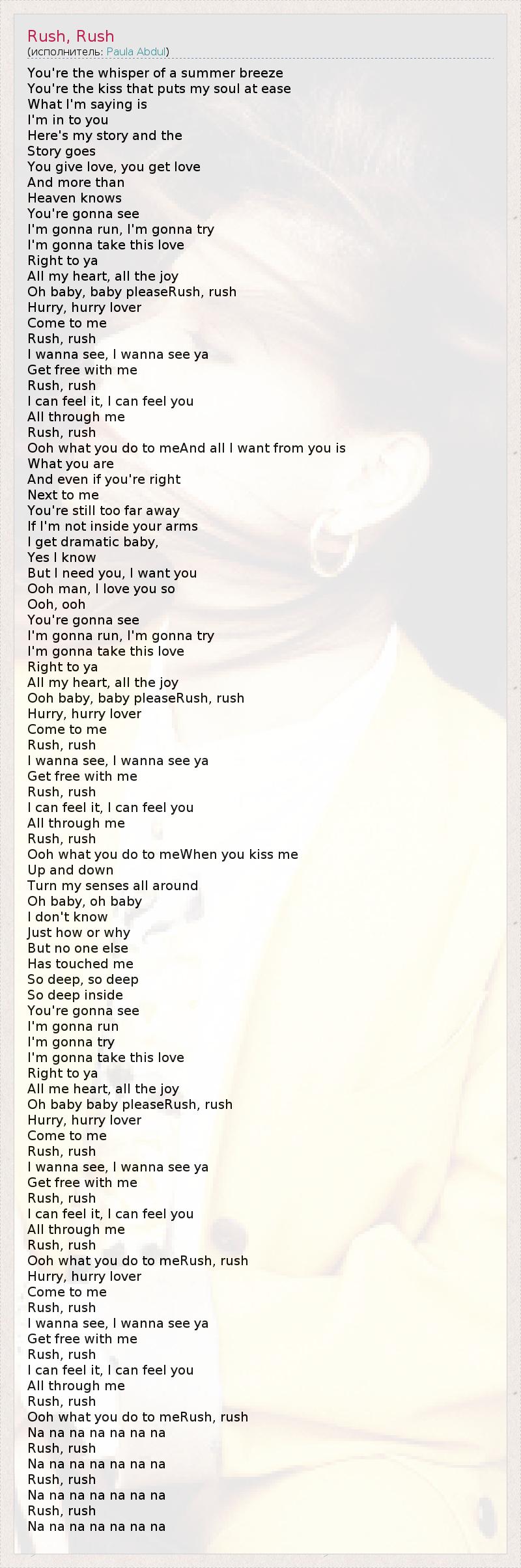 You're the whisper of a summer breeze You're the kiss that puts my soul at ease What I'm saying is I'm in to you Here's my story and the Story goes You give love, you get love And more than Heaven knows You're gonna see I'm gonna run, I'm gonna try I'm gonna take this love Right to ya All my heart, all the joy Oh baby, baby pleaseRush, rush Hurry, hurry lover Come to me Rush, rush I wanna see, I wanna see ya Get free with me Rush, rush I can feel it, I can feel you All through me Rush, rush Ooh what you do to meAnd all I want from you is What you are And even if you're right Next to me You're still too far away If I'm not inside your arms I get dramatic baby, Yes I know But I need you, I want you Ooh man, I love you so Ooh, ooh You're gonna see I'm gonna run, I'm gonna try I'm gonna take this love Right to ya All my heart, all the joy Ooh baby, baby pleaseRush, rush Hurry, hurry lover Come to me Rush, rush I wanna see, I wanna see ya Get free with me Rush, rush I can feel it, I can feel you All through me Rush, rush Ooh what you do to meWhen you kiss me Up and down Turn my senses all around Oh baby, oh baby I don't know Just how or why But no one else Has touched me So deep, so deep So deep inside You're gonna see I'm gonna run I'm gonna try I'm gonna take this love Right to ya All me heart, all the joy Oh baby baby pleaseRush, rush Hurry, hurry lover Come to me Rush, rush I wanna see, I wanna see ya Get free with me Rush, rush I can feel it, I can feel you All through me Rush, rush Ooh what you do to meRush, rush Hurry, hurry lover Come to me Rush, rush I wanna see, I wanna see ya Get free with me Rush, rush I can feel it, I can feel you All through me Rush, rush Ooh what you do to meRush, rush Na na na na na na na Rush, rush Na na na na na na na Rush, rush Na na na na na na na Rush, rush Na na na na na na na