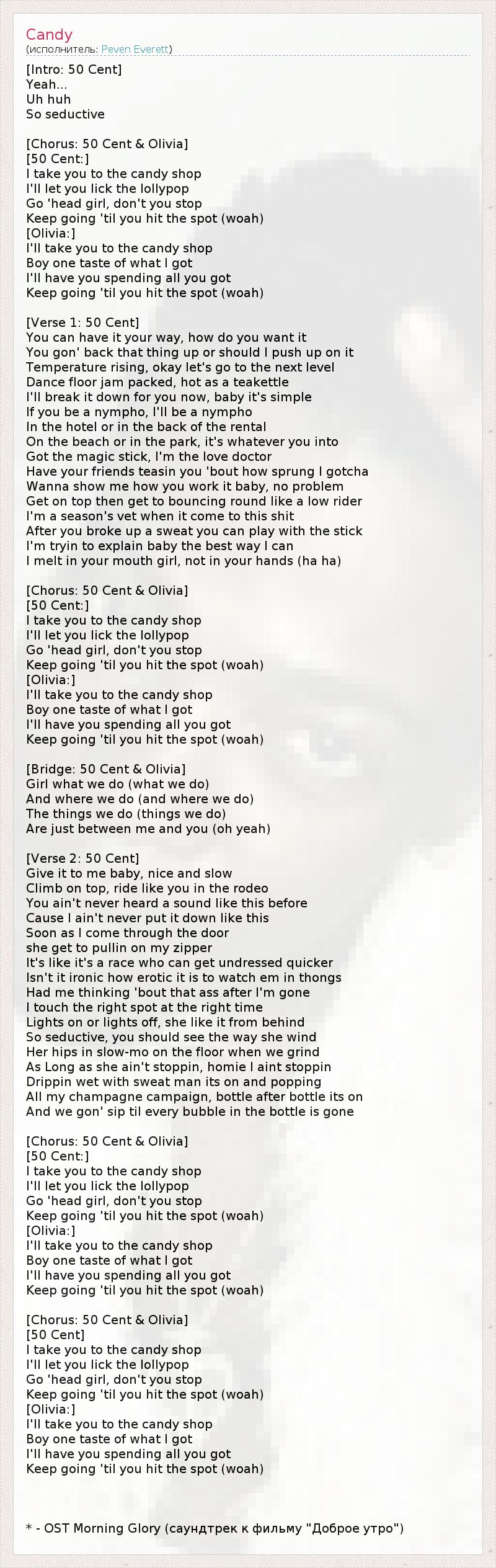 [Intro: 50 Cent] Yeah... Uh huh So seductive [Chorus: 50 Cent & Olivia] [50 Cent:] I take you to the candy shop I'll let you lick the lollypop Go 'head girl, don't you stop Keep going 'til you hit the spot (woah) [Olivia:] I'll take you to the candy shop Boy one taste of what I got I'll have you spending all you got Keep going 'til you hit the spot (woah) [Verse 1: 50 Cent] You can have it your way, how do you want it You gon' back that thing up or should I push up on it Temperature rising, okay let's go to the next level Dance floor jam packed, hot as a teakettle I'll break it down for you now, baby it's simple If you be a nympho, I'll be a nympho In the hotel or in the back of the rental On the beach or in the park, it's whatever you into Got the magic stick, I'm the love doctor Have your friends teasin you 'bout how sprung I gotcha Wanna show me how you work it baby, no problem Get on top then get to bouncing round like a low rider I'm a season's vet when it come to this shit After you broke up a sweat you can play with the stick I'm tryin to explain baby the best way I can I melt in your mouth girl, not in your hands (ha ha) [Chorus: 50 Cent & Olivia] [50 Cent:] I take you to the candy shop I'll let you lick the lollypop Go 'head girl, don't you stop Keep going 'til you hit the spot (woah) [Olivia:] I'll take you to the candy shop Boy one taste of what I got I'll have you spending all you got Keep going 'til you hit the spot (woah) [Bridge: 50 Cent & Olivia] Girl what we do (what we do) And where we do (and where we do) The things we do (things we do) Are just between me and you (oh yeah) [Verse 2: 50 Cent] Give it to me baby, nice and slow Climb on top, ride like you in the rodeo You ain't never heard a sound like this before Cause I ain't never put it down like this Soon as I come through the door she get to pullin on my zipper It's like it's a race who can get undressed quicker Isn't it ironic how erotic it is to watch em in thongs Had me thinking 'bout that ass after I'm gone I touch the right spot at the right time Lights on or lights off, she like it from behind So seductive, you should see the way she wind Her hips in slow-mo on the floor when we grind As Long as she ain't stoppin, homie I aint stoppin Drippin wet with sweat man its on and popping All my champagne campaign, bottle after bottle its on And we gon' sip til every bubble in the bottle is gone [Chorus: 50 Cent & Olivia] [50 Cent:] I take you to the candy shop I'll let you lick the lollypop Go 'head girl, don't you stop Keep going 'til you hit the spot (woah) [Olivia:] I'll take you to the candy shop Boy one taste of what I got I'll have you spending all you got Keep going 'til you hit the spot (woah) [Chorus: 50 Cent & Olivia] [50 Cent] I take you to the candy shop I'll let you lick the lollypop Go 'head girl, don't you stop Keep going 'til you hit the spot (woah) [Olivia:] I'll take you to the candy shop Boy one taste of what I got I'll have you spending all you got Keep going 'til you hit the spot (woah) * - OST Morning Glory (саундтрек к фильму "Доброе утро")