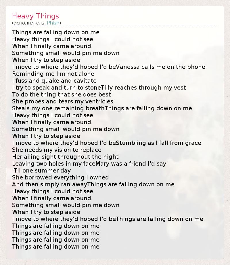 Things are falling down on me Heavy things I could not see When I finally came around Something small would pin me down When I try to step aside I move to where they'd hoped I'd beVanessa calls me on the phone Reminding me I'm not alone I fuss and quake and cavitate I try to speak and turn to stoneTilly reaches through my vest To do the thing that she does best She probes and tears my ventricles Steals my one remaining breathThings are falling down on me Heavy things I could not see When I finally came around Something small would pin me down When I try to step aside I move to where they'd hoped I'd beStumbling as I fall from grace She needs my vision to replace Her ailing sight throughout the night Leaving two holes in my faceMary was a friend I'd say 'Til one summer day She borrowed everything I owned And then simply ran awayThings are falling down on me Heavy things I could not see When I finally came around Something small would pin me down When I try to step aside I move to where they'd hoped I'd beThings are falling down on me Things are falling down on me Things are falling down on me Things are falling down on me Things are falling down on me