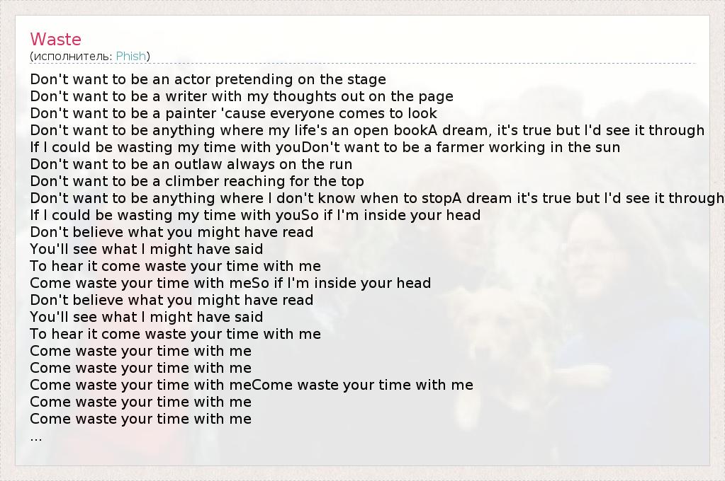 Don't want to be an actor pretending on the stage Don't want to be a writer with my thoughts out on the page Don't want to be a painter 'cause everyone comes to look Don't want to be anything where my life's an open bookA dream, it's true but I'd see it through If I could be wasting my time with youDon't want to be a farmer working in the sun Don't want to be an outlaw always on the run Don't want to be a climber reaching for the top Don't want to be anything where I don't know when to stopA dream it's true but I'd see it through If I could be wasting my time with youSo if I'm inside your head Don't believe what you might have read You'll see what I might have said To hear it come waste your time with me Come waste your time with meSo if I'm inside your head Don't believe what you might have read You'll see what I might have said To hear it come waste your time with me Come waste your time with me Come waste your time with me Come waste your time with meCome waste your time with me Come waste your time with me Come waste your time with me ...