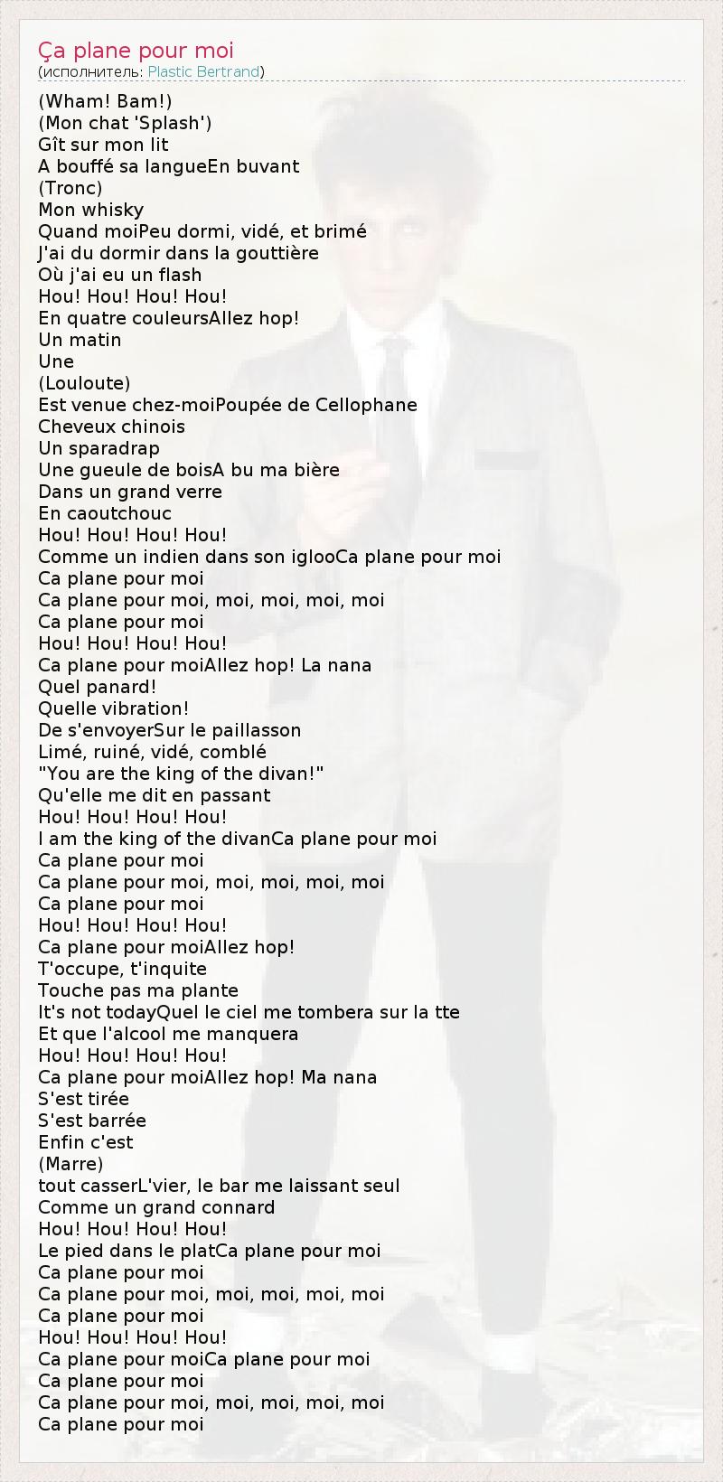 (Wham! Bam!) (Mon chat 'Splash') Gît sur mon lit A bouffé sa langueEn buvant (Tronc) Mon whisky Quand moiPeu dormi, vidé, et brimé J'ai du dormir dans la gouttière Où j'ai eu un flash Hou! Hou! Hou! Hou! En quatre couleursAllez hop! Un matin Une (Louloute) Est venue chez-moiPoupée de Cellophane Cheveux chinois Un sparadrap Une gueule de boisA bu ma bière Dans un grand verre En caoutchouc Hou! Hou! Hou! Hou! Comme un indien dans son iglooCa plane pour moi Ca plane pour moi Ca plane pour moi, moi, moi, moi, moi Ca plane pour moi Hou! Hou! Hou! Hou! Ca plane pour moiAllez hop! La nana Quel panard! Quelle vibration! De s'envoyerSur le paillasson Limé, ruiné, vidé, comblé "You are the king of the divan!" Qu'elle me dit en passant Hou! Hou! Hou! Hou! I am the king of the divanCa plane pour moi Ca plane pour moi Ca plane pour moi, moi, moi, moi, moi Ca plane pour moi Hou! Hou! Hou! Hou! Ca plane pour moiAllez hop! T'occupe, t'inquite Touche pas ma plante It's not todayQuel le ciel me tombera sur la tte Et que l'alcool me manquera Hou! Hou! Hou! Hou! Ca plane pour moiAllez hop! Ma nana S'est tirée S'est barrée Enfin c'est (Marre) tout casserL'vier, le bar me laissant seul Comme un grand connard Hou! Hou! Hou! Hou! Le pied dans le platCa plane pour moi Ca plane pour moi Ca plane pour moi, moi, moi, moi, moi Ca plane pour moi Hou! Hou! Hou! Hou! Ca plane pour moiCa plane pour moi Ca plane pour moi Ca plane pour moi, moi, moi, moi, moi Ca plane pour moi