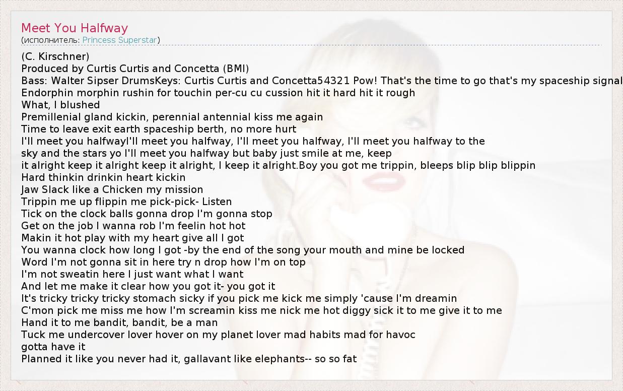 (C. Kirschner) Produced by Curtis Curtis and Concetta (BMI) Bass: Walter Sipser DrumsKeys: Curtis Curtis and Concetta54321 Pow! That's the time to go that's my spaceship signal Endorphin morphin rushin for touchin per-cu cu cussion hit it hard hit it rough What, I blushed Premillenial gland kickin, perennial antennial kiss me again Time to leave exit earth spaceship berth, no more hurt I'll meet you halfwayI'll meet you halfway, I'll meet you halfway, I'll meet you halfway to the sky and the stars yo I'll meet you halfway but baby just smile at me, keep it alright keep it alright keep it alright, I keep it alright.Boy you got me trippin, bleeps blip blip blippin Hard thinkin drinkin heart kickin Jaw Slack like a Chicken my mission Trippin me up flippin me pick-pick- Listen Tick on the clock balls gonna drop I'm gonna stop Get on the job I wanna rob I'm feelin hot hot Makin it hot play with my heart give all I got You wanna clock how long I got -by the end of the song your mouth and mine be locked Word I'm not gonna sit in here try n drop how I'm on top I'm not sweatin here I just want what I want And let me make it clear how you got it- you got it It's tricky tricky tricky stomach sicky if you pick me kick me simply 'cause I'm dreamin C'mon pick me miss me how I'm screamin kiss me nick me hot diggy sick it to me give it to me Hand it to me bandit, bandit, be a man Tuck me undercover lover hover on my planet lover mad habits mad for havoc gotta have it Planned it like you never had it, gallavant like elephants-- so so fat
